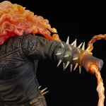 The Ghost Rider Premium Format™ Figure is fully sculpted from the flames on his head to his hellish base. An included alternate portrait shows him mid-transformation, as his mortal flesh is seared away to reveal the rider within. His moto jacket and pants have distressed leather-like textures and are decorated with silver spikes to give Ghost Rider his signature streetwear look. Additional orange paint highlights on his costume capture the look of light and heat as hellfire burns all around him on this fateful ride.