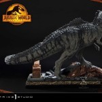 With a long and narrow skull, lined with extremely sharp, serrated teeth, its powerful jaw is open, about to snap on its prey, crushing the bones and flesh altogether. Muscular legs, stepping on the ruins of a partially destroyed Sanctuary, ready to lunge at high speed. Texturing, shading and coloring, big scales, a long-striped tail, and every little detail take this piece to the next level. This massive carnivore theropod is ready to wreak havoc and lay its enemy to waste. The base features a layer of fossils beneath the earth and the crumbles of the Biosyn Sanctuary.