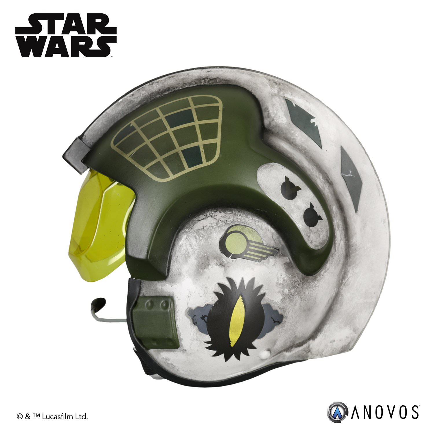 The helmet is assembled and ready to wear with weathered finish and Gold Leader Squadron markings.
