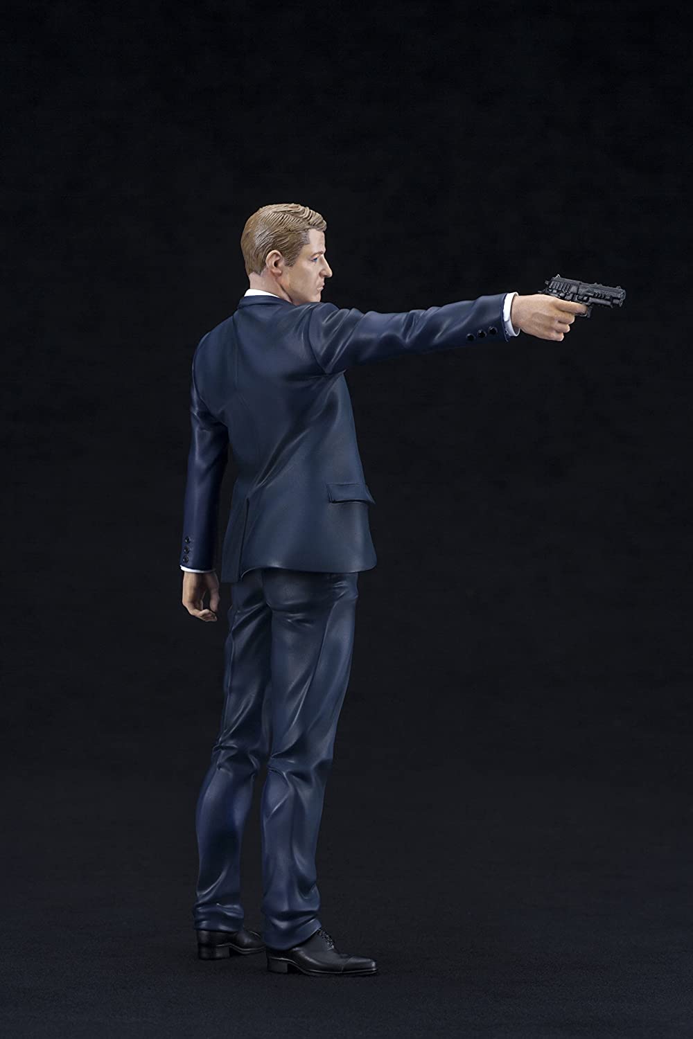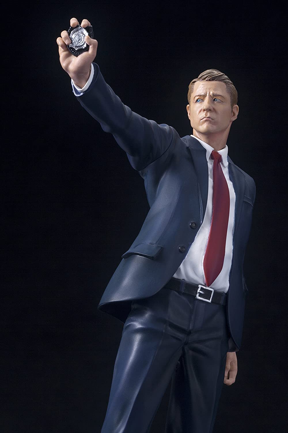 Standing up to crime the only way he knows how, Detective Gordon hits the streets. Jim wears his signature blue suit with white shirt, red tie, and black shoes and belt, and you can see how rumpled and creased it is from his late nights and long shifts. He stands in a rigid pose, turned sideways to present a smaller profile to potential targets. His arm extends straight out, his head swiveled to stare down the criminals in front of him. You can display Jim in two different ways with interchangeable hand parts; he can either present his Gotham City Police Department badge to make an arrest or wield his service pistol. Either way the detective has a fiercely determined expression on his face that perfectly captures the look of Ben McKenzie. Gordon stands just over 7 inches tall (in the ARTFX+ 1/10th scale), and magnets in his feet provide perfect stability on the included display base. Jim is a great addition to your Kotobukiya DC collection, and he’ll pair perfectly with other upcoming Gotham ARTFX+ statues like Penguin!