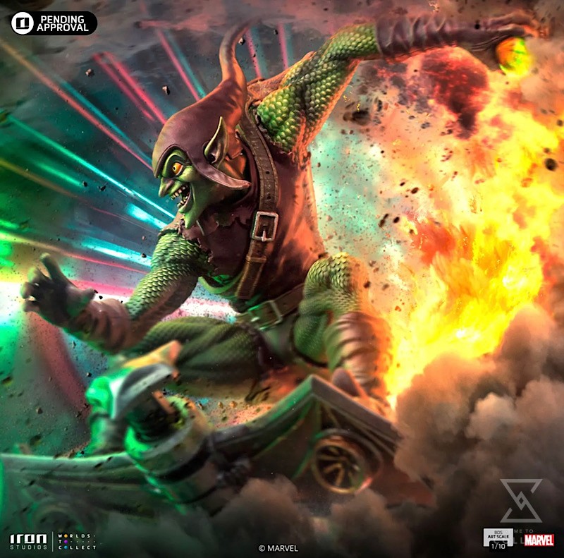 Followed by a dense cloud of smoke emitted by the rocket-propelled Goblin Glider, a sinister figure clad in a tunic, hood, gloves, and purple boots, along with an emerald chain mail resembling scales, executes a low flight over wreckage and artifacts of an apparent laboratory, ready to hurl one of his pumpkin bombs, one of his primary weapons, which he throws with precise aim, rarely missing his target. With his inseparable bag of tricks slung over his shoulder, containing various other lethal themed weapons, and his wide yellow eyes focused on his target, along with his ever-present insane smile on his horrifying face, Iron Studios presents the statue “Green Goblin – Spider-man vs Villains Diorama – BDS Art Scale 1/10”, expanding the creation of an Iron Studios diorama inspired by Marvel comics, in which Spider-Man faces some of his greatest archenemies, with Green Goblin considered the greatest among them in the Rogue’s gallery of the arachnid hero.