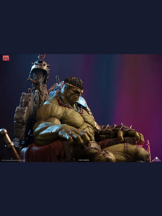 The Green Scar Hulk is a tortured character with a tragic past. To capture the character’s inner demons, this 1/4 Hulk statue includes three unique head sculpts. Each sculpt features the Green Goliath looking forward menacingly as he grips his throne. The Regular Edition sees the Hulk with his lips pursed together. While the Premium Edition features the same head sculpt with two additional sculpts. One gritted teeth no helmet. The other with gritted teeth and his gladiator helmet.