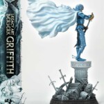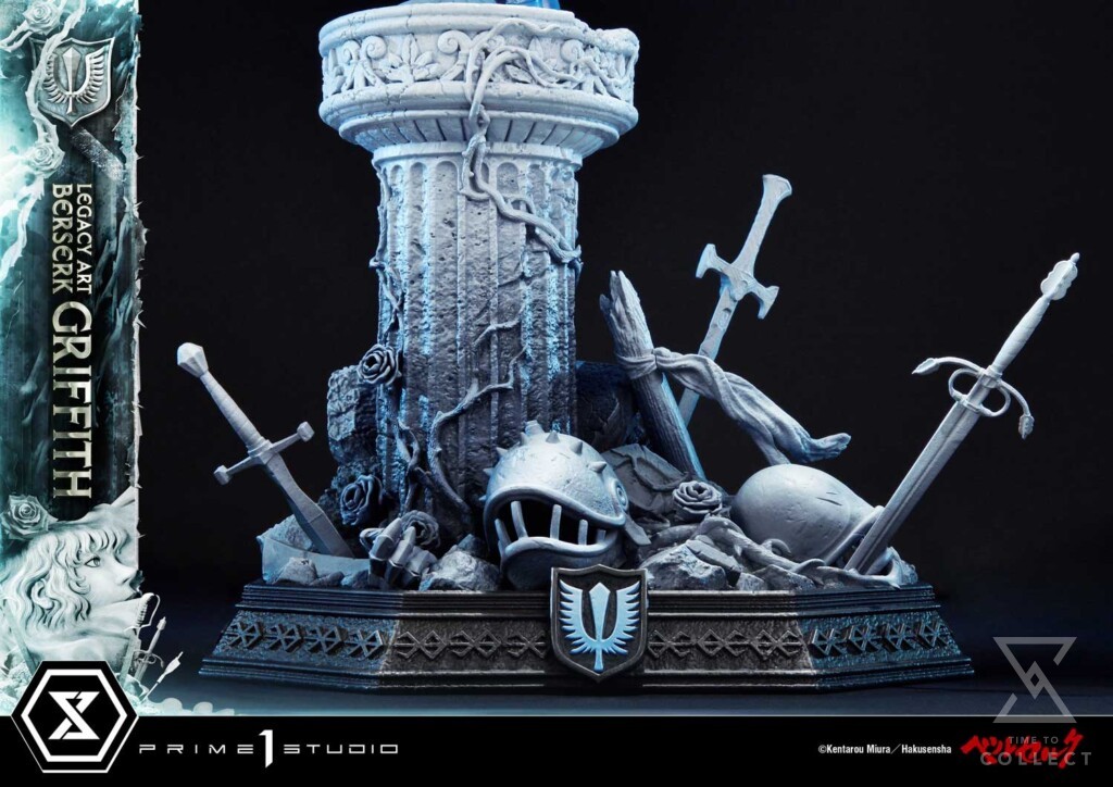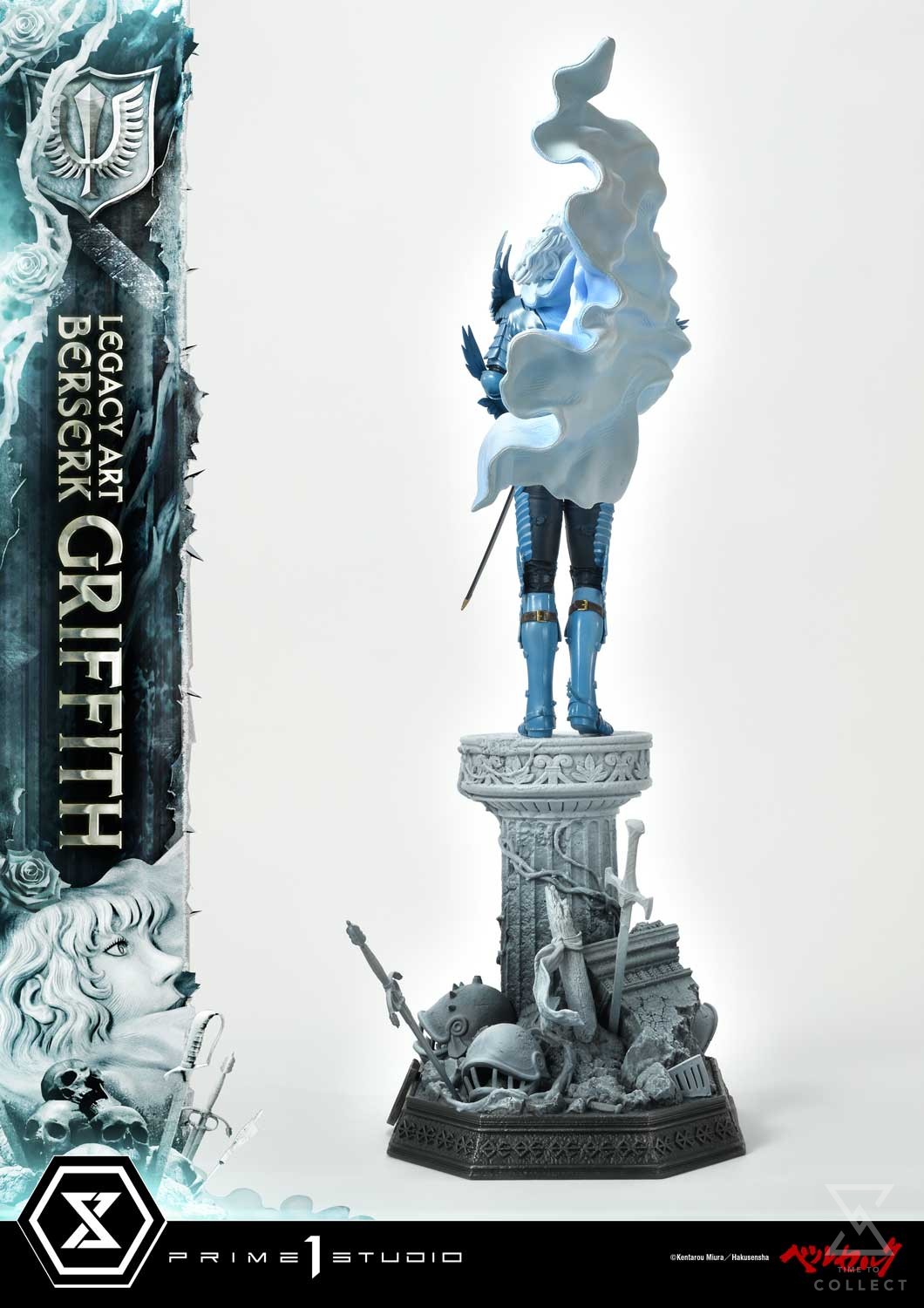Prime 1 Studio is proud to present the second piece to our Legacy Art series: LABR-02S: 1/6 Scale Legacy Art “Kentaro Miura” Berserk Griffith Bonus Version from Berserk! Kentaro Miura was the creator and artist of the manga series “Berserk”. His tragic passing left a huge void, not just in the Japanese manga and anime world, but also in the hearts of his dearest fans. The artists at Prime 1 Studio have come together to bring you another breathtaking piece to pay homage to his monumental legacy. Griffith’s tale is one of ambition, a compelling and tragic narrative that delves into the depths of human nature. From humble beginnings as a charismatic and enigmatic leader of the Band of the Falcon, he rises to become a formidable figure in the war-torn world. Griffith’s ambition drives him to great heights and ultimately to his own downfall, leading him to sacrifice his humanity to become God Hand’s fifth member, known as Femto. At 22 inches tall, Griffith dons his Falcon of Light armor, as he stands atop a stone pillar surrounded by remains and weapons of his fallen enemies. His lavish silver armor is skillfully shaded with sky blue. The leader of the Band of the Falcon sheathes his golden rapier, his preferred weapon of deadly elegance. His large cape flows behind him gracefully, carried by the wind, adding a dreamlike atmosphere to this stunning piece. Our talented artists and sculptors have masterfully etched Griffith’s face in the cape, creating a captivating and divine visual experience – sure to leave anyone gripped by the dreamlike ambiance.