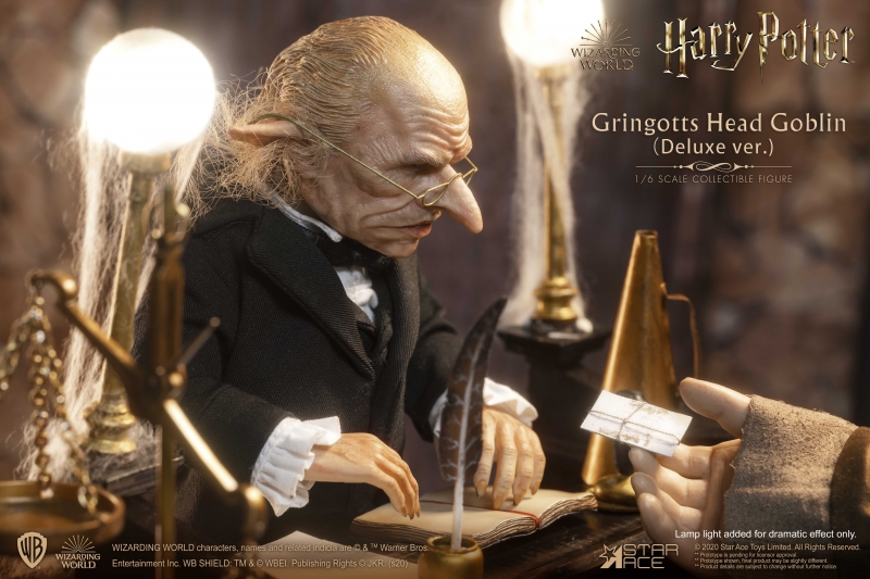 This 1/6 scale Goblin features an all-new portrait of Warwick Davis made up as the Head Goblin and dressed in his black suit. - – 1/6th scale all new articulated body, approximately 19.5 cm tall.