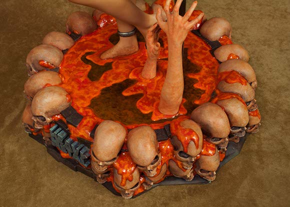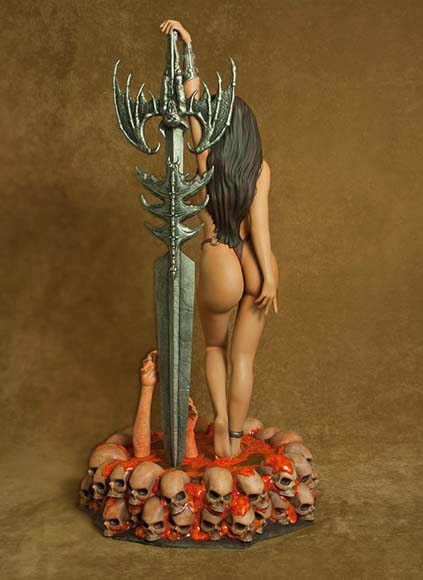 Inspired by the cover artwork from the Summer 2004 edition of Heavy Metal Magazine by James Ryman, this sexy mercenary is depicted gun in hand, standing over the Alien Creature she has just Exterminated with her sword. The highly detailed base features the slain Alien oozing green blood & is littered with the skulls of some of its earlier victims.