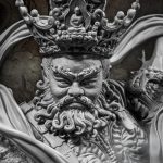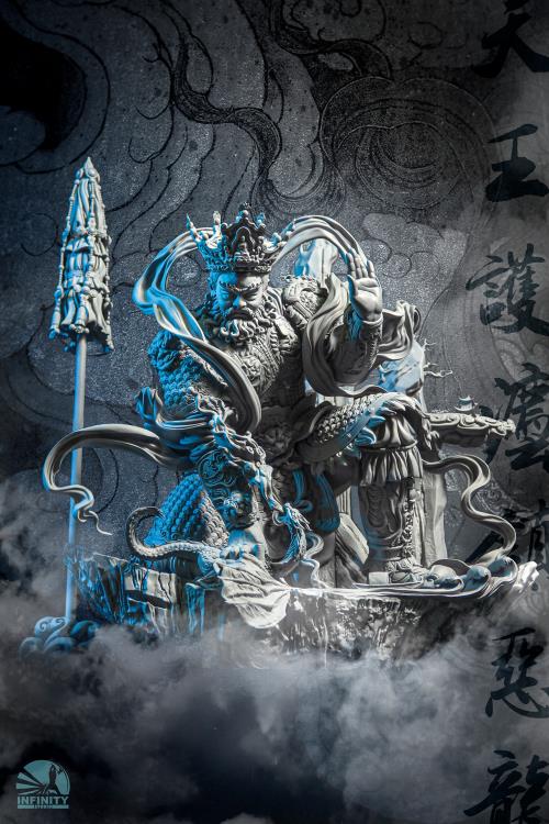 Since LuoQisheng was a child, was fascinated by the world of Celestrail and Buddha, he always imagines a scene that a Guardian of Heaven as huge as a mountian descends from the sky, dust was spreaded all over the ground, this guardian defeats all kinds of evil and shakes the world. Traditional Buddhist art tends to pay a lot of attention in the details of the sculpture to resemble magnificent and solemnity. The pattern design of the armor were particularly complicated.Luo’s put a lot of effort to portray the details of it. Murals in Fahai temple and sculpture of Shuang Ling Temple were use as reference to depicts Guardian’s portrait. The base were designed to look like shape of Chinese ingot ( also known as Yuan Bao . A currency that used in ancient China) this is due to the fact that Guardian of Heaven of North (Vaishravana)were often refer to the wealth deity.