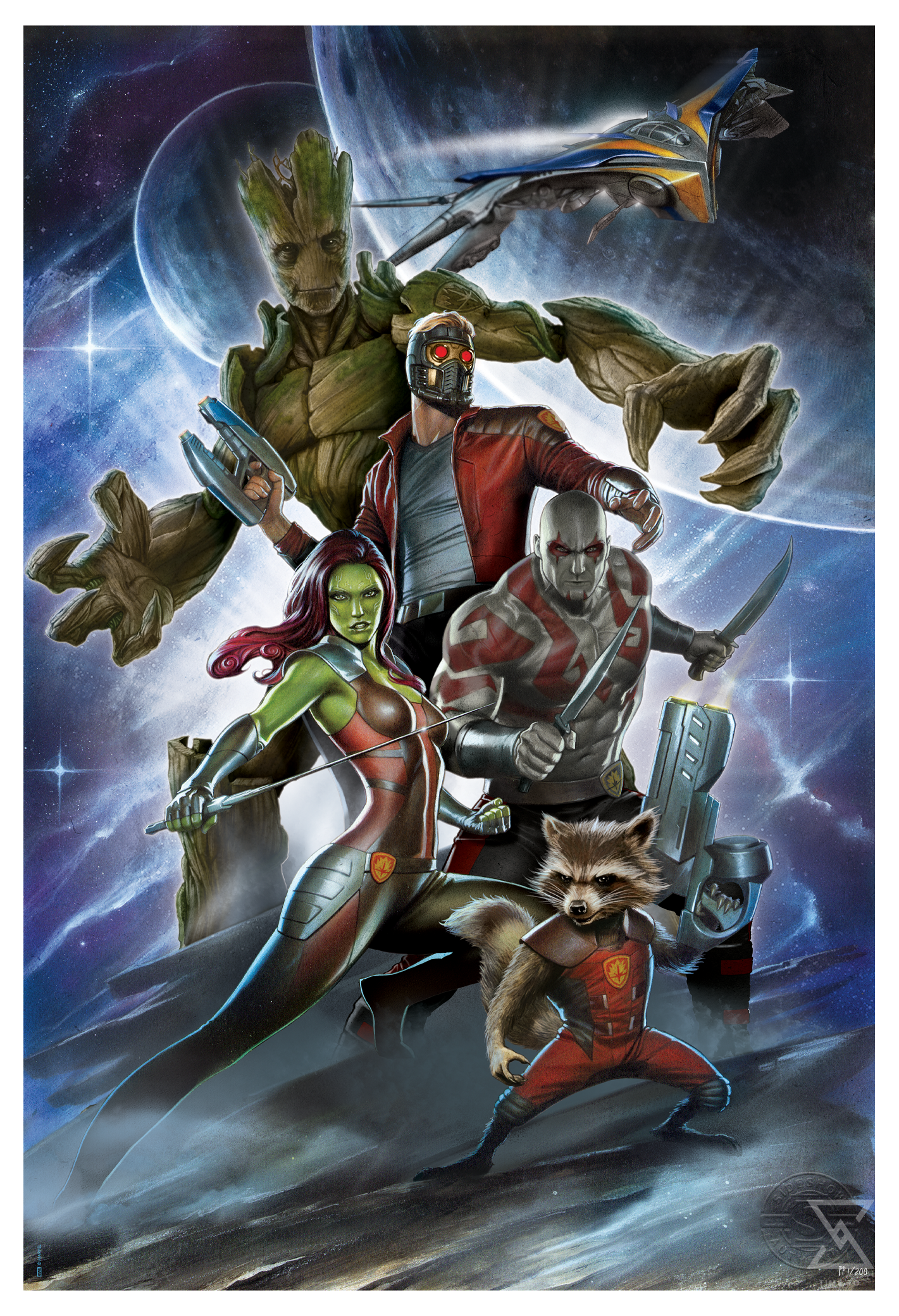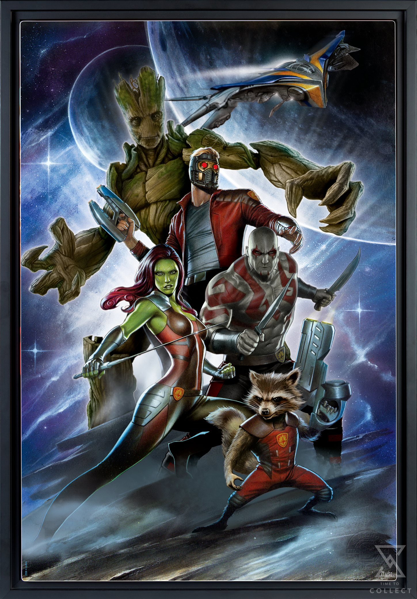 Originally created as a variant cover for Guardians of the Galaxy: Castaways (2016), a book written by David McDonald for Marvel, this super hero art is now available to fans as an unframed giclée print or in a custom framed presentation. Each Guardians of the Galaxy: Castaways Fine Art Print features an embossed Sideshow Seal of Authenticity as part of the limited edition of 200 pieces.