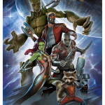 The Guardians of the Galaxy stand proud and battle-ready against a starry blue backdrop in this heroic team portrait. Rocket Raccoon and Gamora lead the charge in their brightly colored costumes. Drax and Star-Lord bring up the center with weapons drawn. Finally, Groot towers above his teammates while the Milano soars in the distance, ready to whisk its crew away — or toward — some trouble.