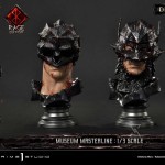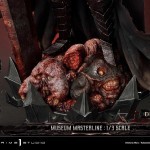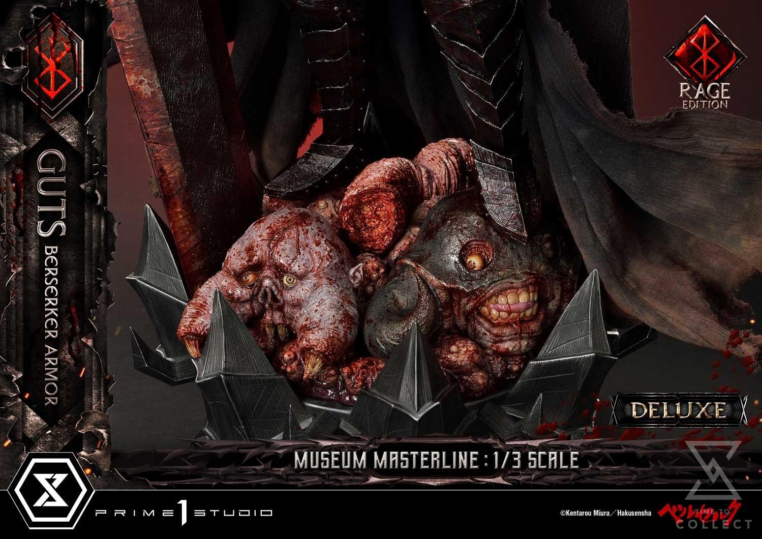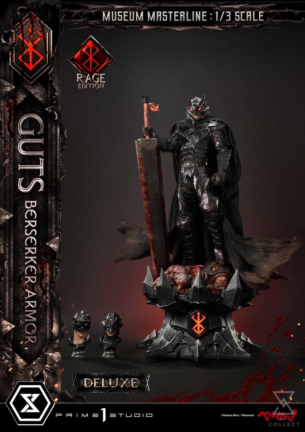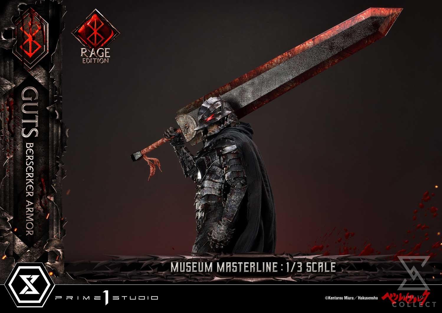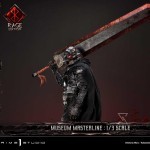 Prime 1 Studio is proud to present its latest addition to the Museum Masterline Series: MMBR-03DXS 1:3 Scale Guts, Berserker Armor, Rage Edition Deluxe Bonus Version from Berserk! The wonderful craftspeople at Prime 1 Studio bring you another jaw-dropping statue of Guts, the Black Swordsman! Their interpretation of Guts – taking a breather from all the bloody slaughter – stands at an impressive 47 inches tall to the raised tip of Dragonslayer!!! Rage has overtaken Guts in this sobering statue. His realistic fabric cape frames his intimidating bulk as his hand firmly grips Dragonslayer. Guts’ blood-drenched Berserker armor is the star of this show, as it is faithfully recreated with multi-layered paint applications, weathering, and washes to bring out every infinitesimal detail and texture. The blood effects added to this statue are second to none. Looking at his blood-soaked Dragonslayer, one gets an immediate impression of Guts as a non-stop, death-dealing force of nature, against all who stand in his way.