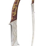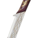 Arwen’s sword is called Hadhafang, which means throng cleaver. It once belonged to the Elven princess Idril, who wed a mortal man and bore Earendil, the father of Elrond, who in turn was father to Arwen. At the end of the Second Age of Middle-Earth, before Arwen was born, Elrond wielded Hadhafang during the Last Alliance of Elves and Men in the great battle against Sauron. Later, his daughter Arwen used this mighty sword when she aided Frodo in his escape from the Ringwraiths (Nazgûl).