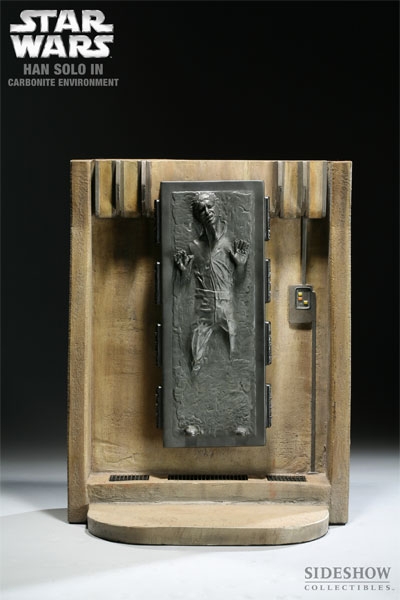 The Han Solo in Carbonite 12-inch Figure Environment captures every detail of the carbonite slab as Han hung suspended as a trophy on Jabba’s wall, motionless and frozen in time. The piece is constructed of highest quality materials, incuding heavy-weight polystone, then hand painted and hand-finished to Sideshow’s exacting standards. Han in Carbonite is suspended from the palace wall display using a single pin and magnet system, and can be removed from the wall for additional display configurations. The Han Solo in Carbonite 12 inch Figure Environment is a stunning addition to any collection, and the perfect complement to your Star Wars 12-inch Figure collection.