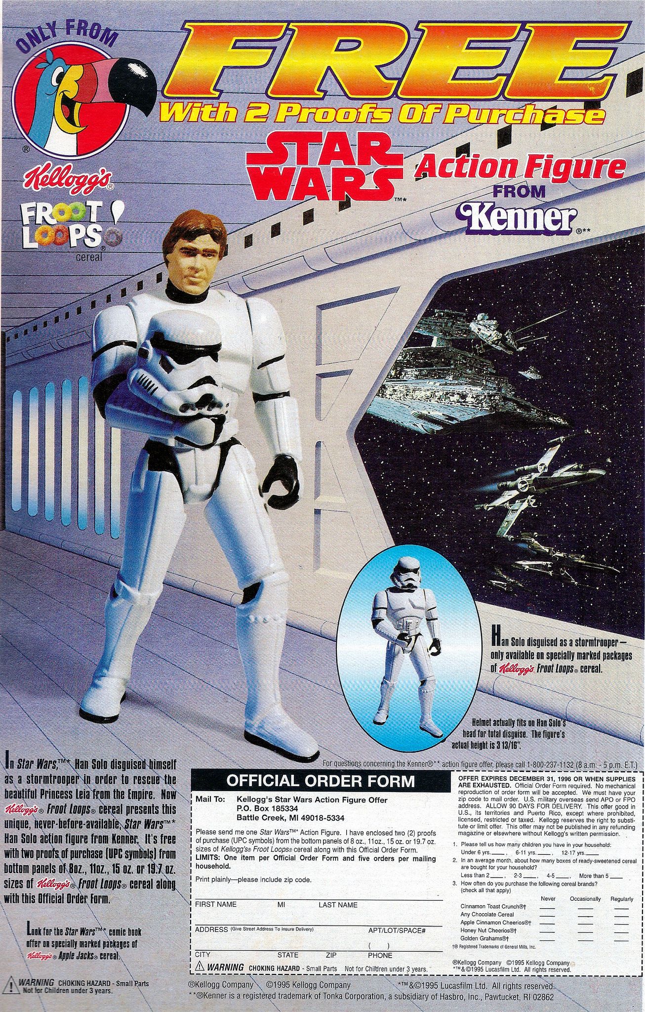 From August 1995 through December 1996, Han Solo in Stormtrooper Disguise was available exclusively as part of a Kellogg’s FROOT LOOPS cereal offer. By sending in the official order form and 2 proofs of purchase, you would receive the figure for free in the mail.