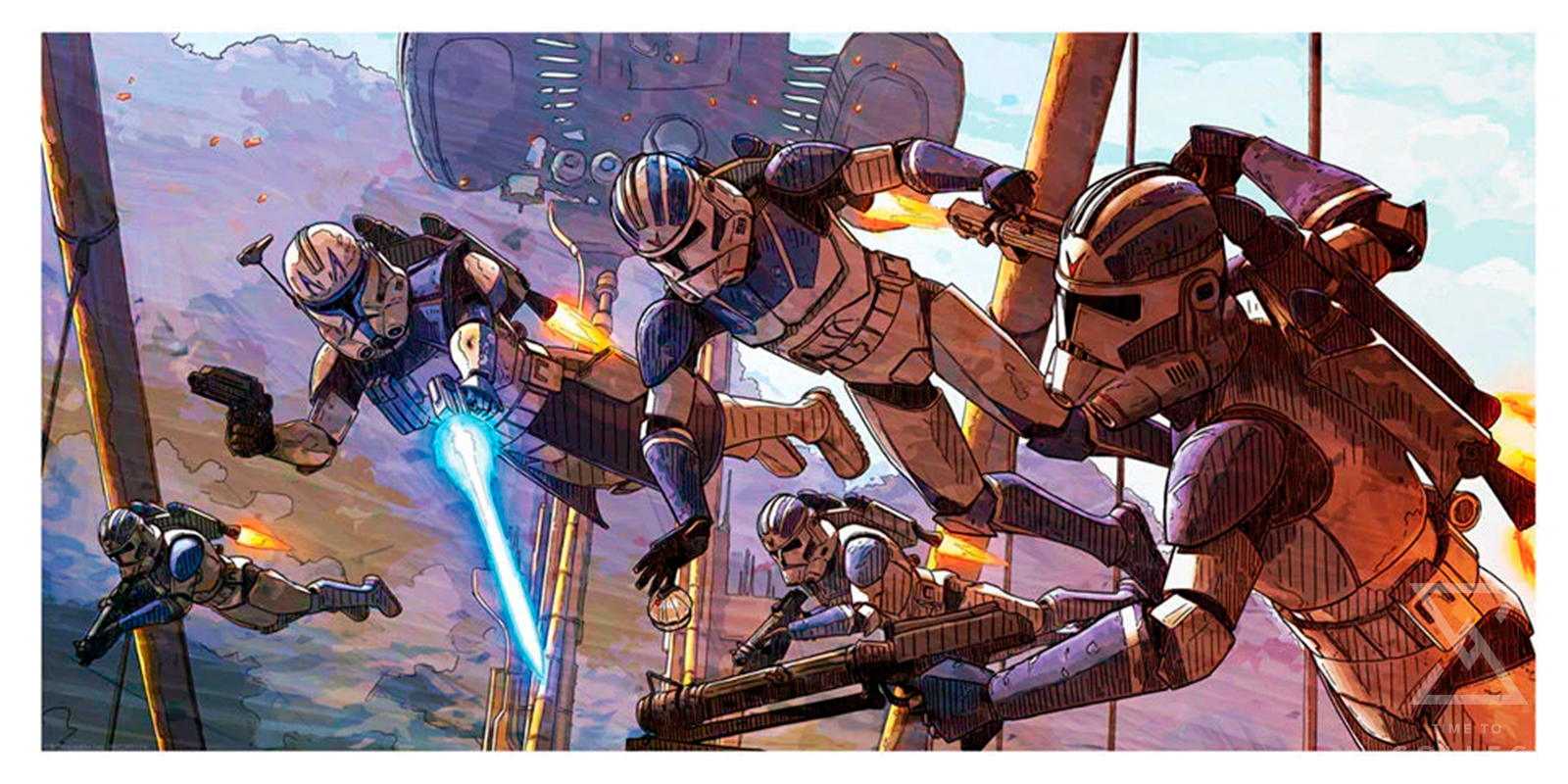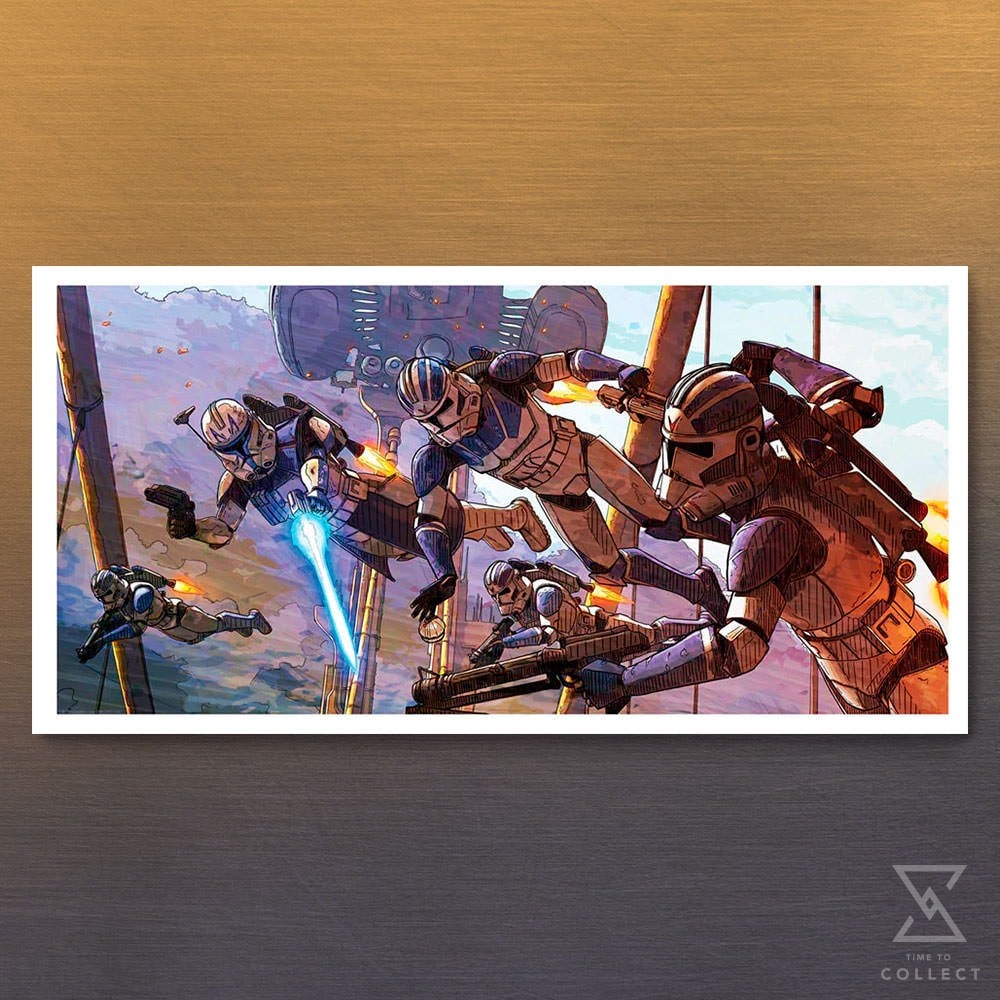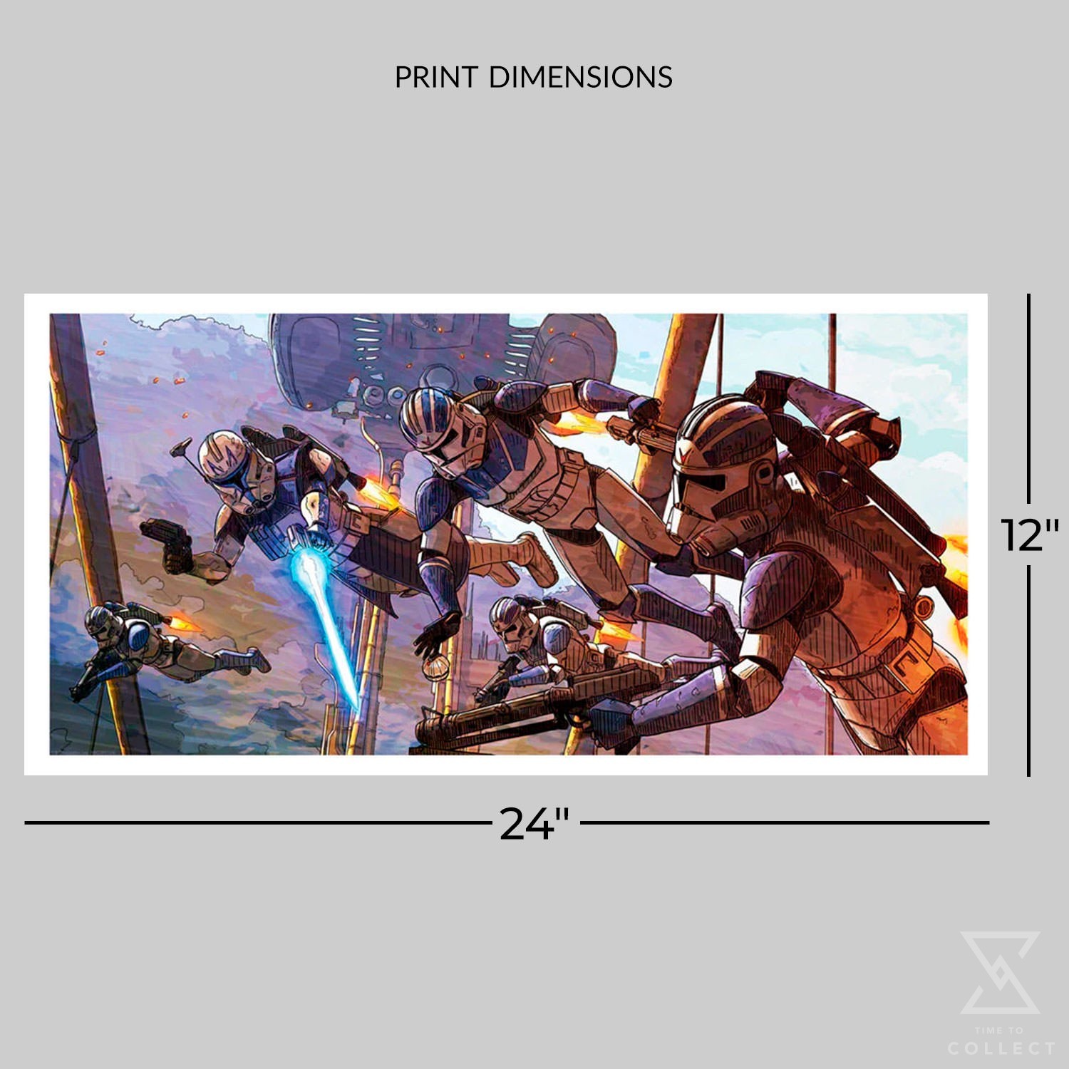 Captain Rex and company pull off an incredible sneak attack in this high-flying Star Wars artwork inspired by Star Wars: The Clone Wars. Each fine art lithograph print is hand-numbered from a limited edition of 295 pieces and comes with a Certificate of Authenticity.