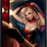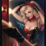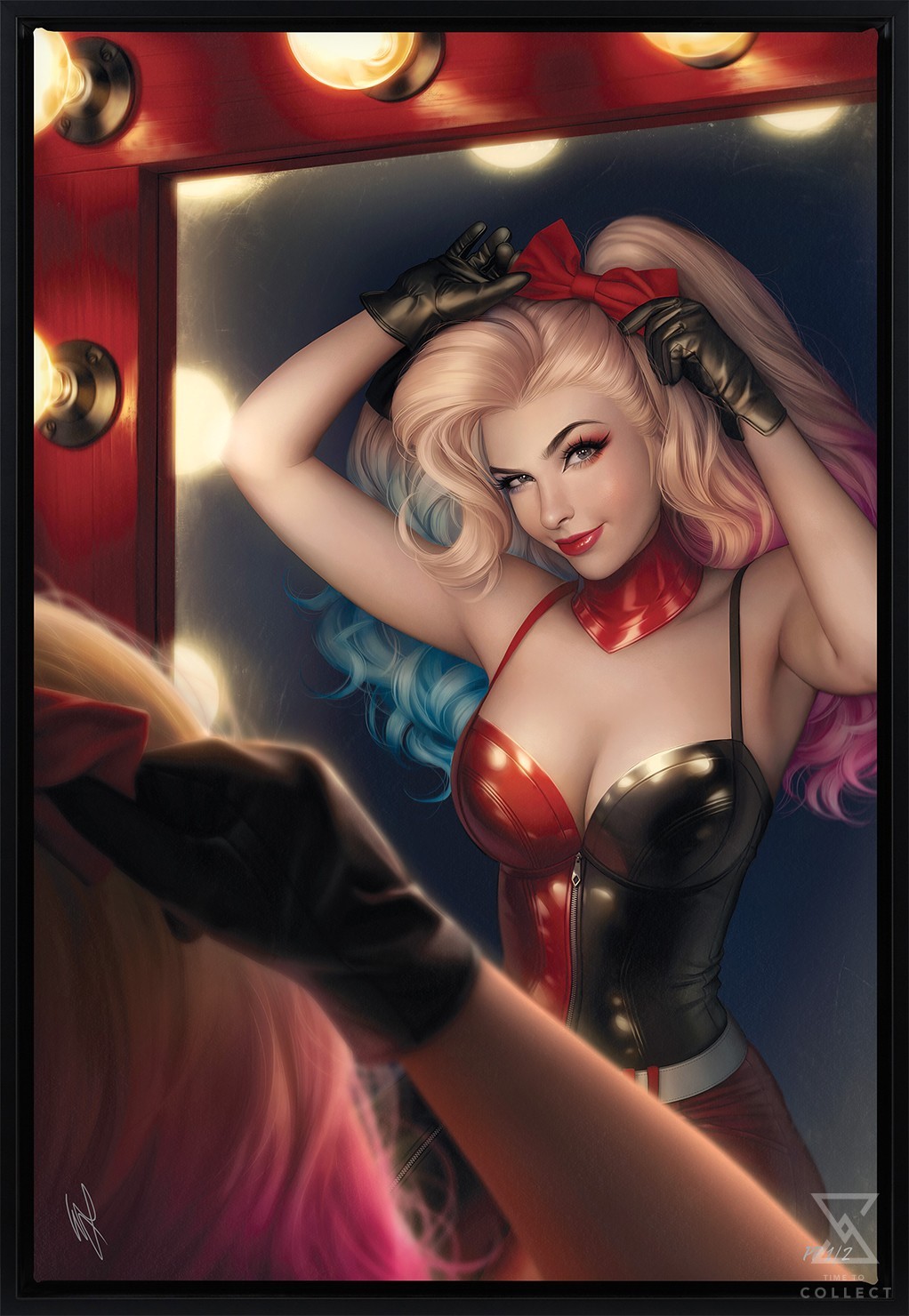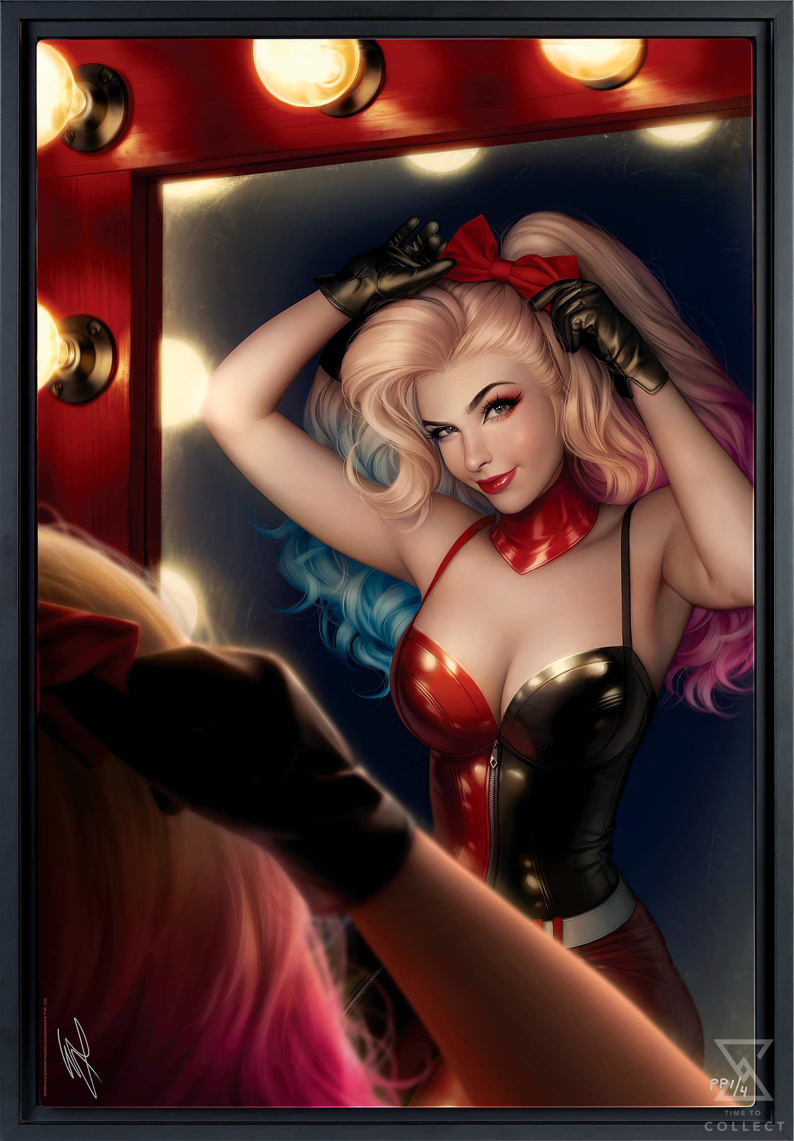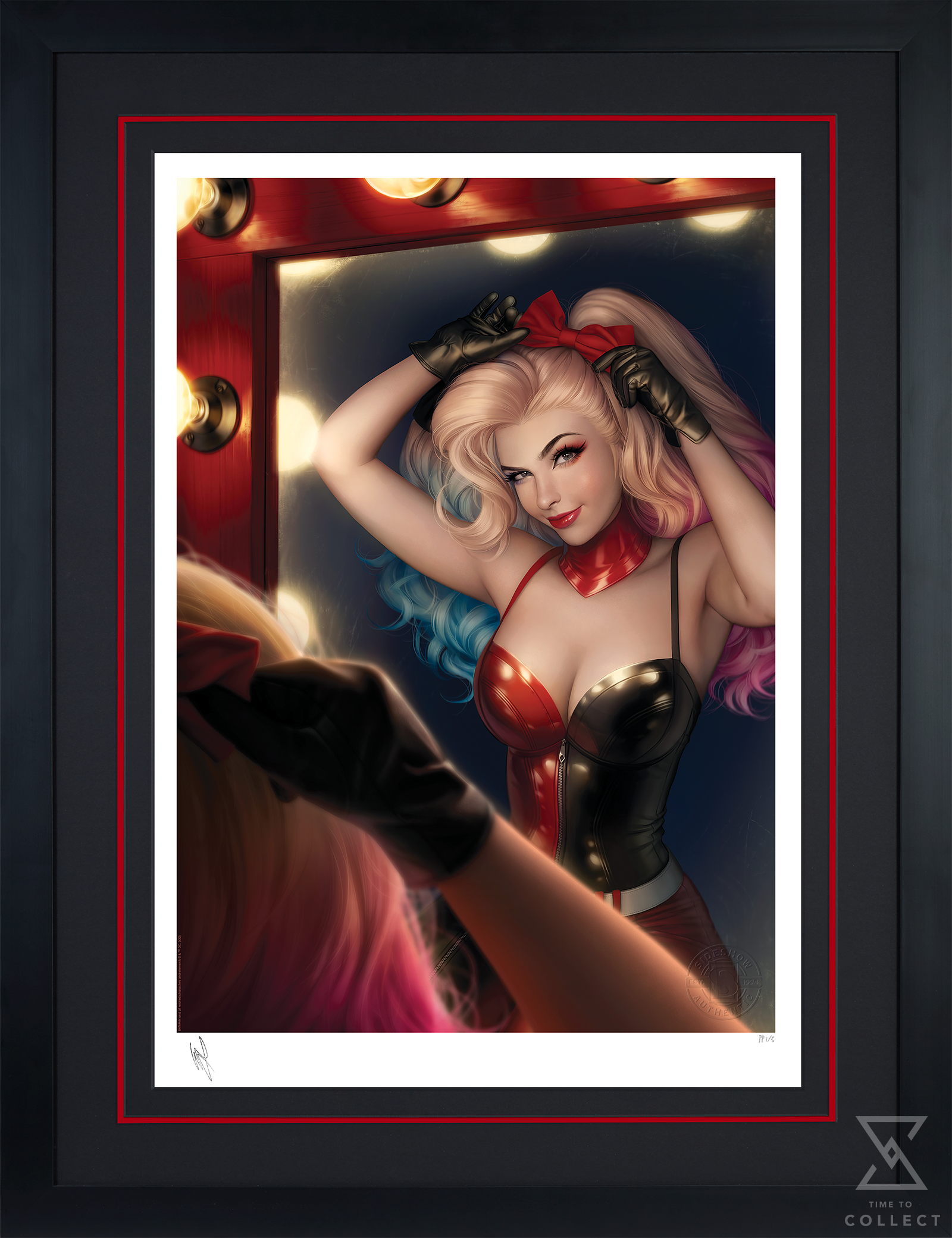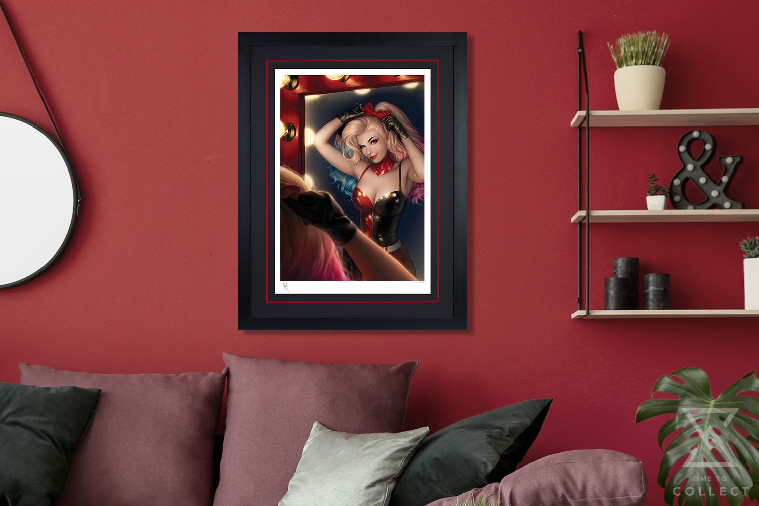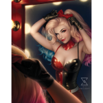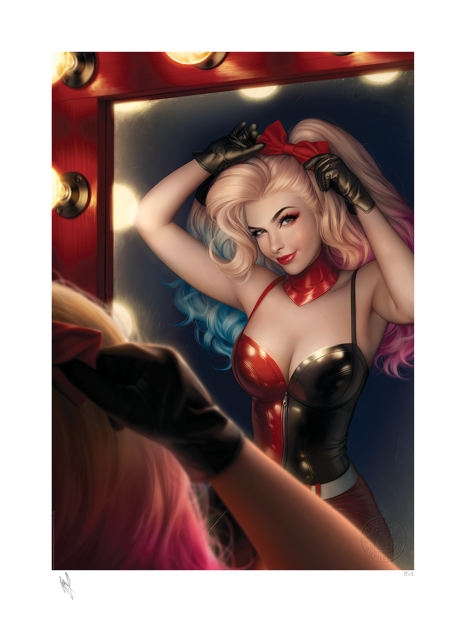 The Harley Quinn #1 Fine Art Print features Harley-frickin’-Quinn herself wearing a black and red corset as she poses in front of a lightbulb-lined dressing room mirror. Her blonde hair, tipped in bubblegum pink and cotton candy blue, cascades down her arms and back as she pulls a red bow into place. Harley further accessorizes with black gloves, a red collar necklace, a white belt, and perfectly painted red lips, proving to the audience lingering over her shoulder that she’s about to be the star of the stage.