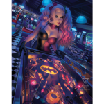 From Arkham to the arcade, Harley Quinn is all about keeping things in Gotham interesting. A bright and blinking Batman pinball machine illuminates the Maid of Mischief in the middle of a glowing neon game center. DC Comics Easter eggs and classic throwbacks pattern this palace of play while the Dark Knight lurks in the shadows of the Bat-room … Sorry, Bruce! It’s Harley’s turn to hit the high score!