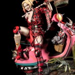 - Playful and crazy Harley perched on a bright pink scooter, with her signature mallet modified into a Kendama (a traditional Japanese toy) inspired weapon with a spiked ball.