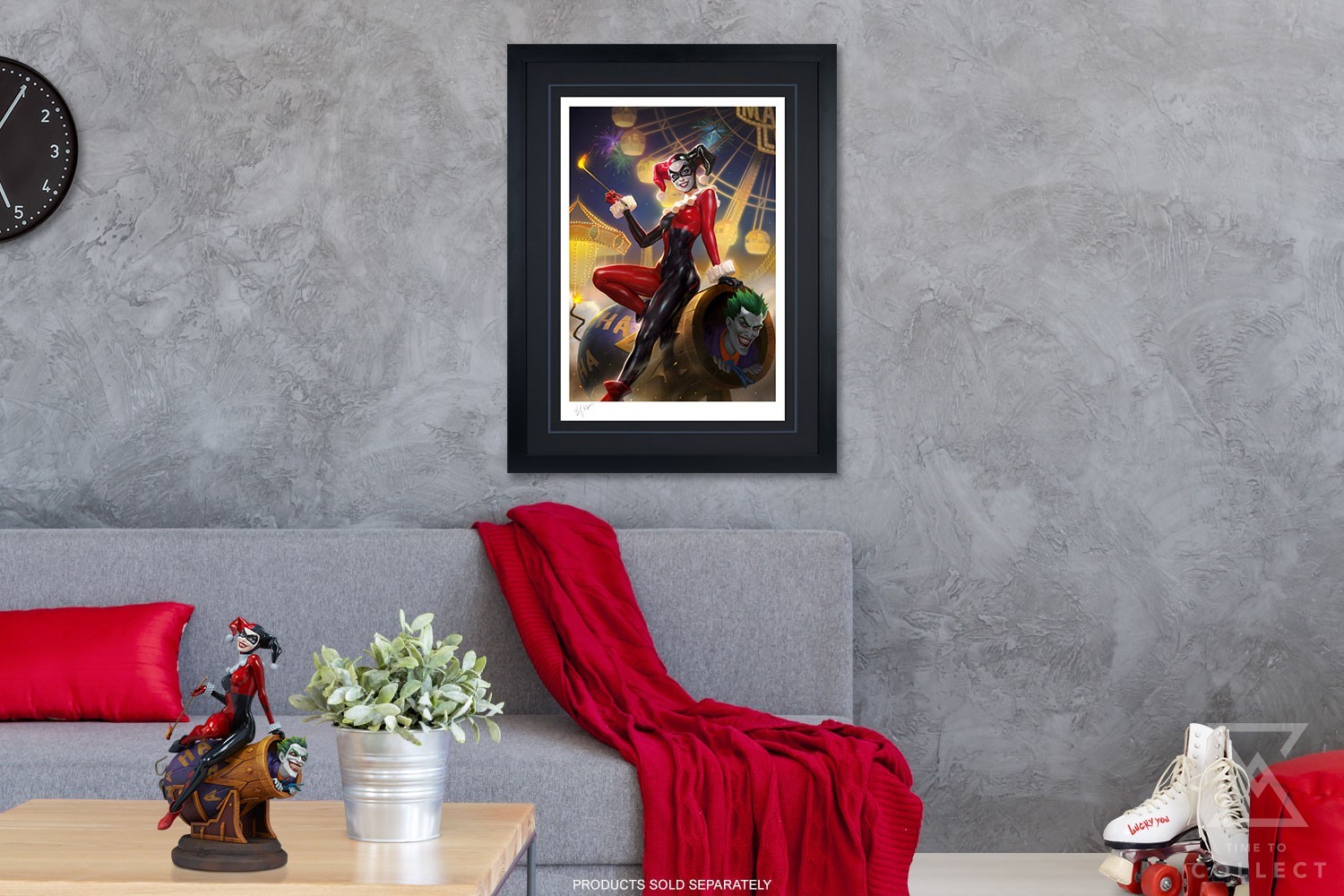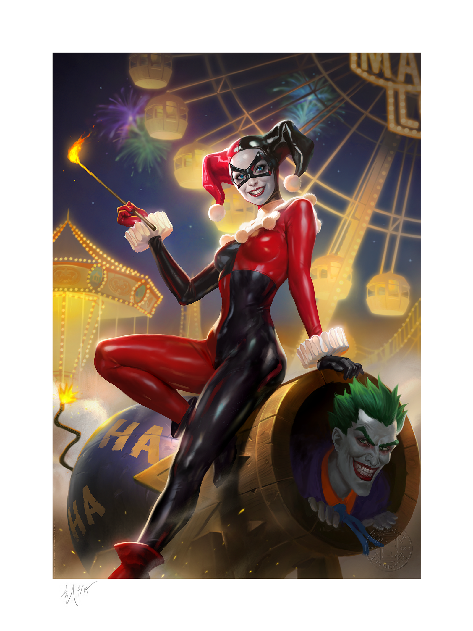 Each Harley Quinn and The Joker Fine Art Print features an authorized, automated artist signature and an embossed Seal of Authenticity as a part of the limited edition of 350 pieces. Pair the pranksters in this Batman wall art with the Harley Quinn and The Joker Diorama by Sideshow for a DC Comics display that really packs a punchline.