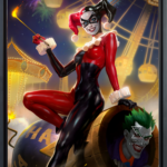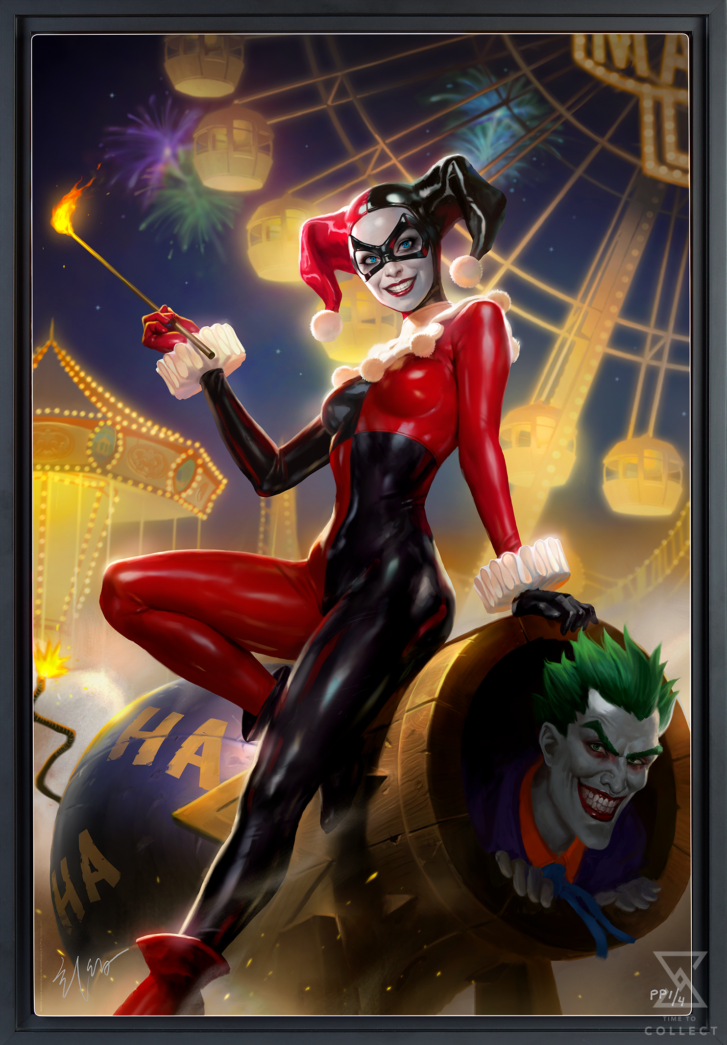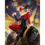 Talk about a villain with a short fuse! In this colorful composition, Gotham’s Clown Prince of Crime prepares to launch himself to infamy with the help of his loyal lady. Harley Quinn sits front and center in her classic red and black costume, holding a lit match as a part of the lovers’ latest act to prank Batman. Inside the cannon, The Joker settles in for an explosive evening beneath the Gotham City sky, complete with festive fireworks and carnival lights.