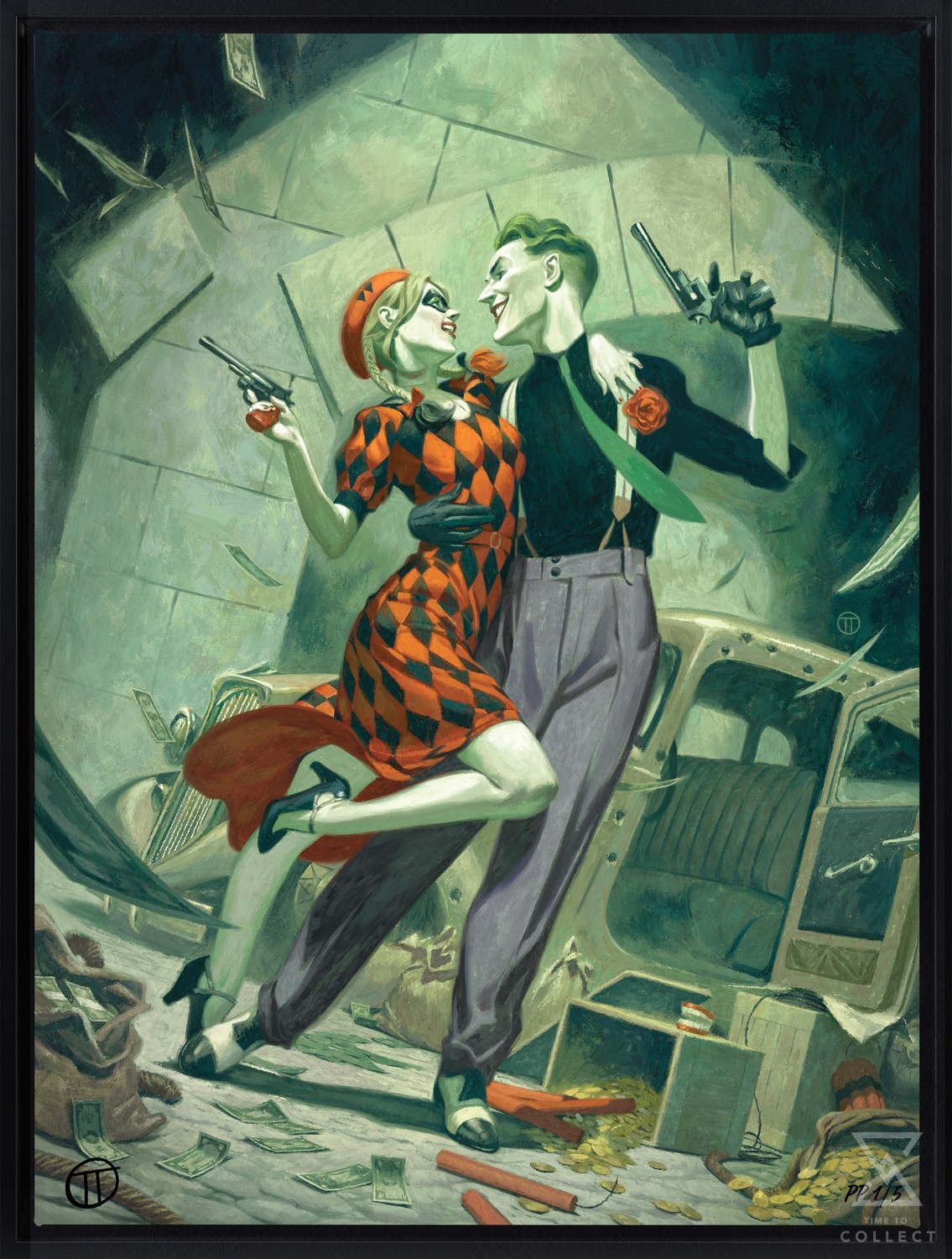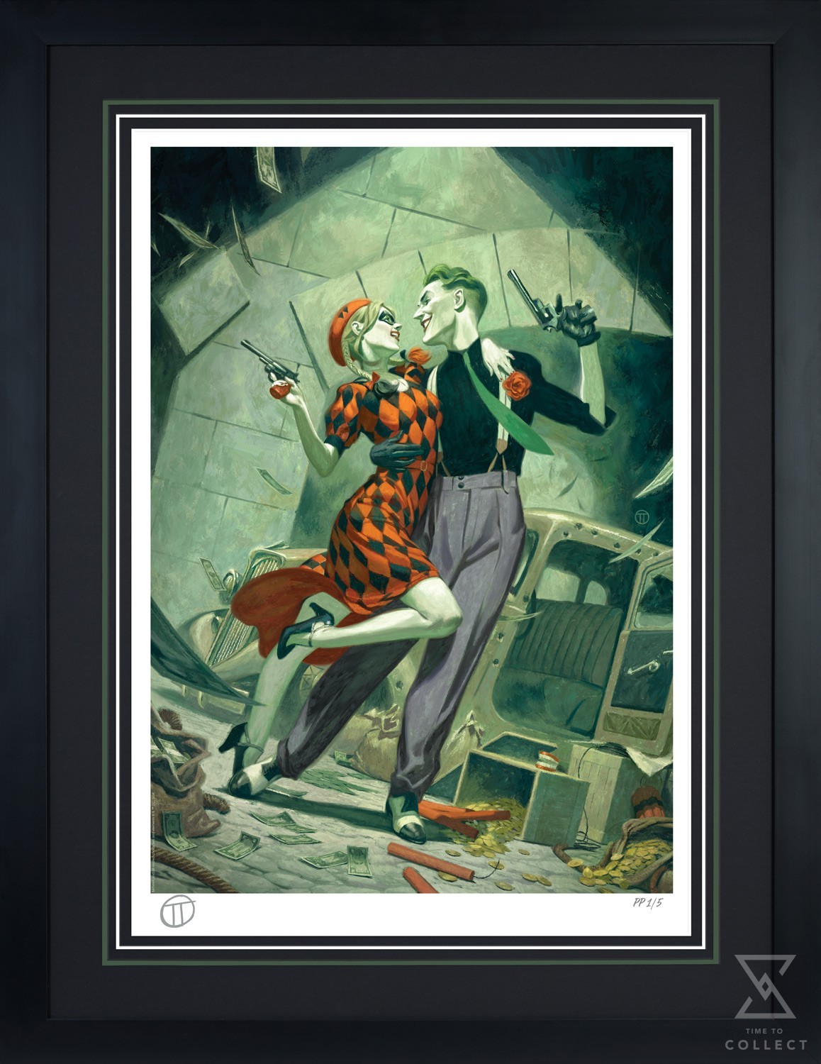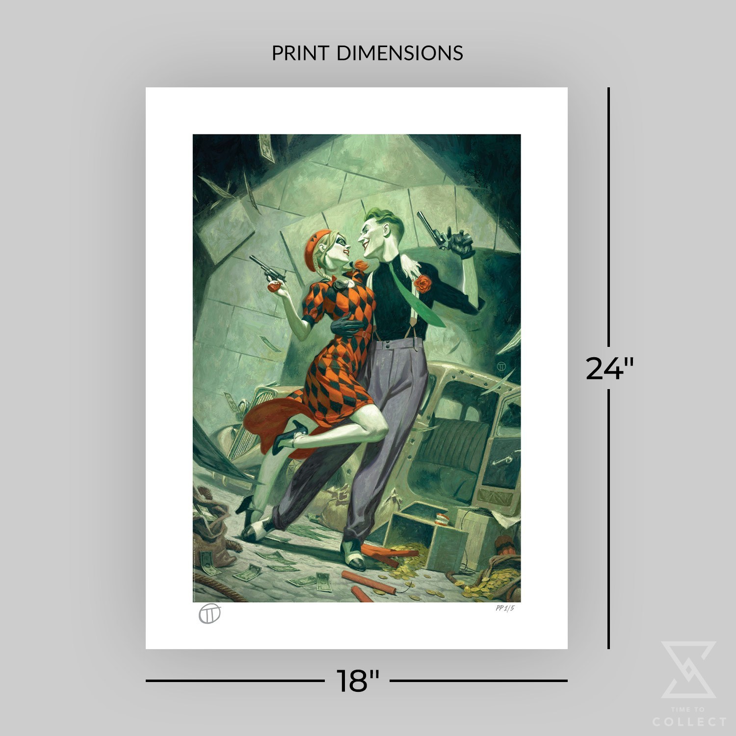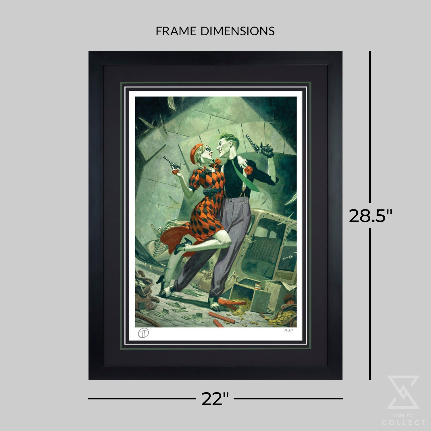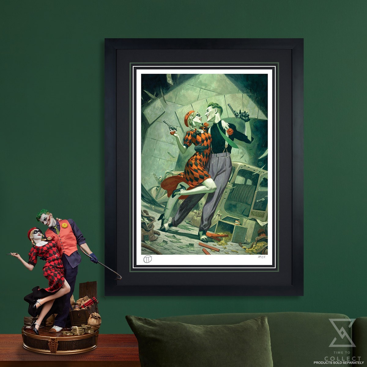 Each Harley Quinn & The Joker Fine Art Print features an authorized, automated artist signature and an embossed Seal of Authenticity as a part of the limited edition of 200 pieces. This DC artwork is available as an unframed giclée print or in a custom framed presentation. Pair it with The Joker and Harley Quinn: Lawless Love Diorama by Sideshow — sold separately — for a swanky tribute to these two lovers on the lam.