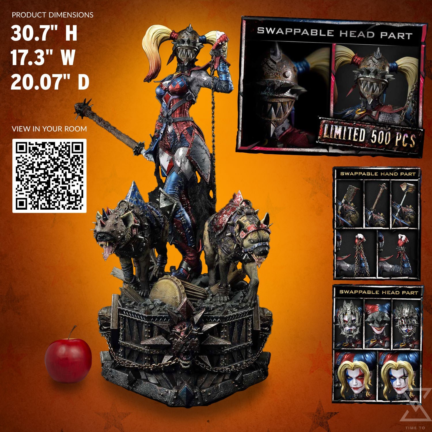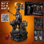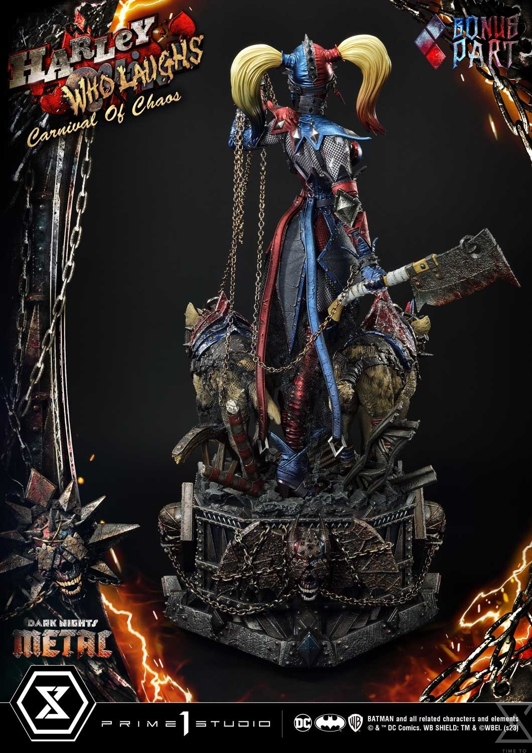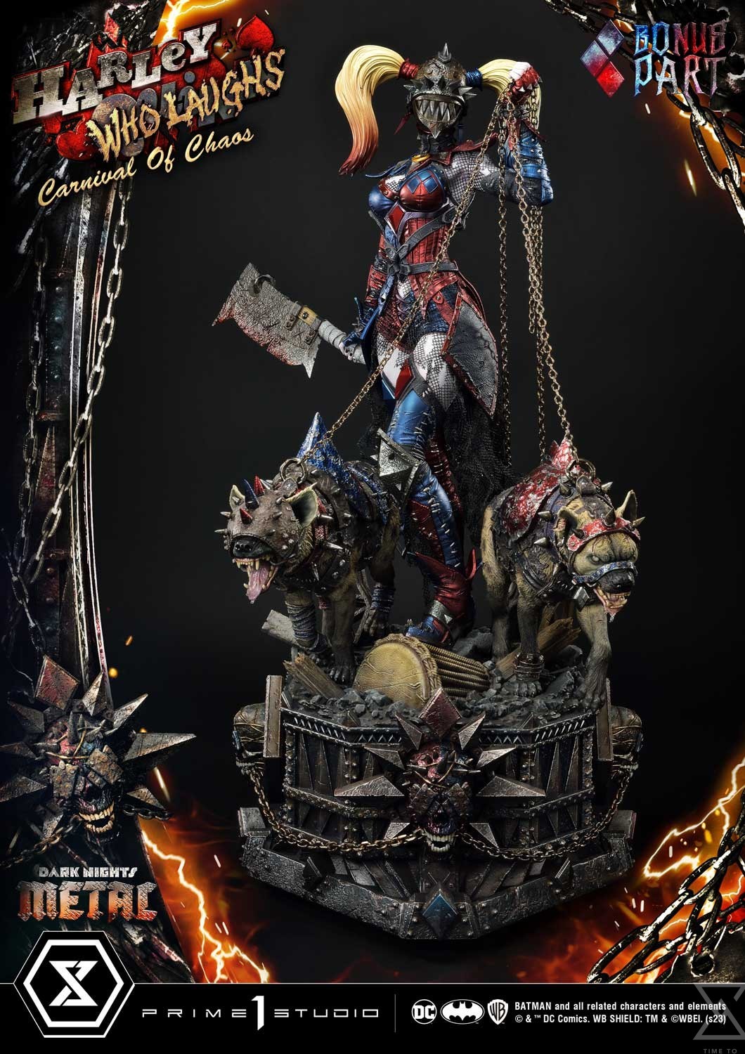 At a whopping 30 inches tall, this incredible Harley Quinn collectible statue is brought to life in her signature red and blue costume, beautifully rendered in metallic and leather textures, a form-fitting ensemble that accentuates her dark allure. The generous use of spikes exudes an air of danger and rebellion, how metal! Her face is encased by an iron caged-style mask, a twisted fusion of metal and darkness that instills fear at its very sight. Alternatively, another swappable head portrait is available for you to display on a headstand, revealing the beautiful face beneath the mask, her peculiar face paint contoured by golden locks. The Queen of Chaos strikes an imposing presence, dark chains in her left hand, holding back her hyenas Bud and Lou. Their eyes gleam with savage hunger and snarling expressions, ready to unleash a brutal and merciless fate upon their prey. She holds a massive meat cleaver that is still dripping with fresh blood. At her feet is a heavy metal ironclad base of pure despair, rubble, chains, blood stains, and skulls, just the right combination to make your skin crawl.