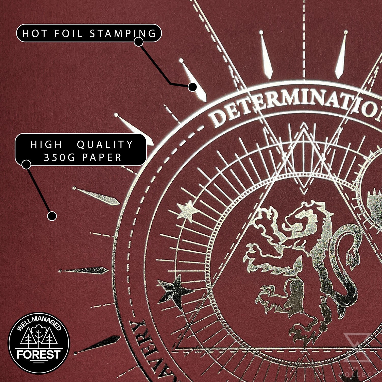 During this pressing, a film of aluminum pigment is placed between the paper and plate, and the pigments are transferred into the engraved recesses, creating the unique foil effect. This sophisticated technique adds a unique touch of shine and texture to every piece.