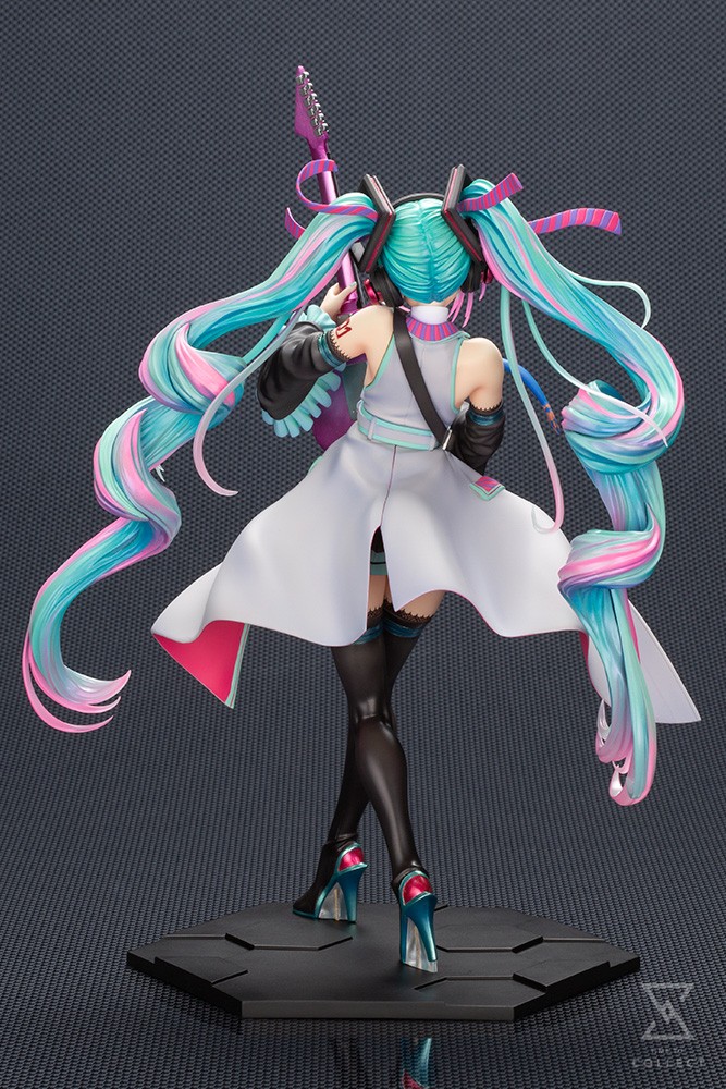 A new line of statues joins Kotobukiya’s popular Bishoujo series: Bishoujo ReMIX series! The first entry in the Bishoujo ReMIX series is Hatsune Miku stylized by Shunya Yamashita. Miku is illustrated and designed in Shunya Yamashita’s style as she plays her guitar on stage! Miku’s trademark twintails are decorated with streaks of pink mixed with her signature hair color. The gradient of colors in her hair from her dark roots to light tips are realistically shown using a clear plastic to create an entrancing display. Shunya Yamashita designed Hatsune Miku’s original outfit with frills all over, which was then faithfully recreated thanks to Kotobukiya’s expert craftsmanship. Emulating how her jacket moves and sways, this figure fully captures her performance as she strums her guitar on stage. Be sure to add this cool Hatsune Miku who can be seen playing her guitar soulfully at a live venue to your very own collection!