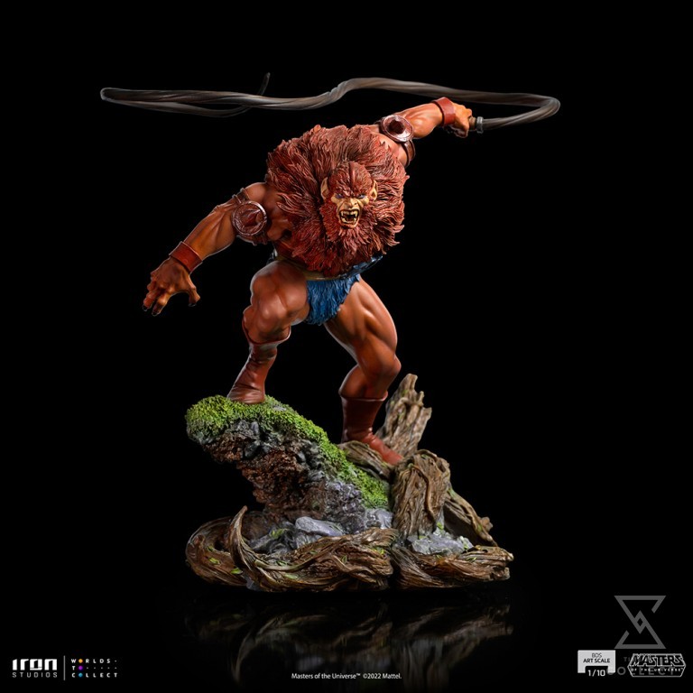 With the crack of his long whip, caused by the air displacement capable of breaking the sound barrier, the animalistic henchman of the infamous sorcerer lord of the Snake Mountain, manipulates with brutality the most fearsome and dangerous creatures from his planet against his opponents. No less threatening than the beasts he commands, over a base of a natural rock elevation covered by mosses and roots, the wild mercenary with orange skin and fur, wearing a red breastplate with an armguard, growls exposing his fangs like a predator ready for attack. Thus, adding forces to Eternia’s evil warriors in their MOTU line, Iron Studios present the statue “Beast Man BDS – Masters of the Universe -Art Scale 1/10”, with Skeletor’s savage right hand.
