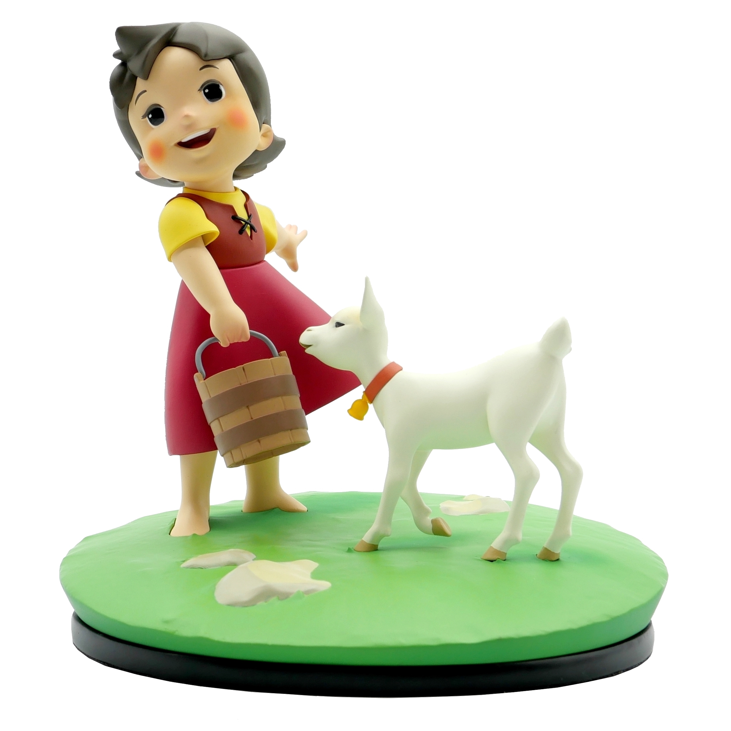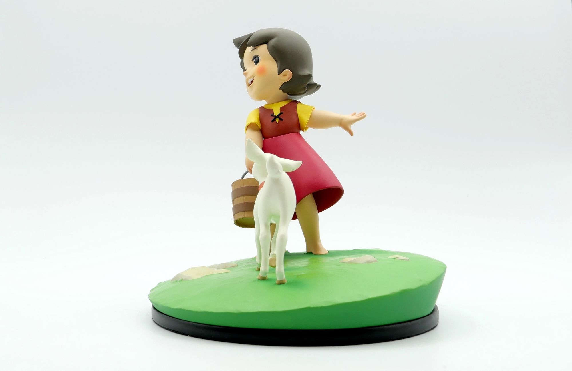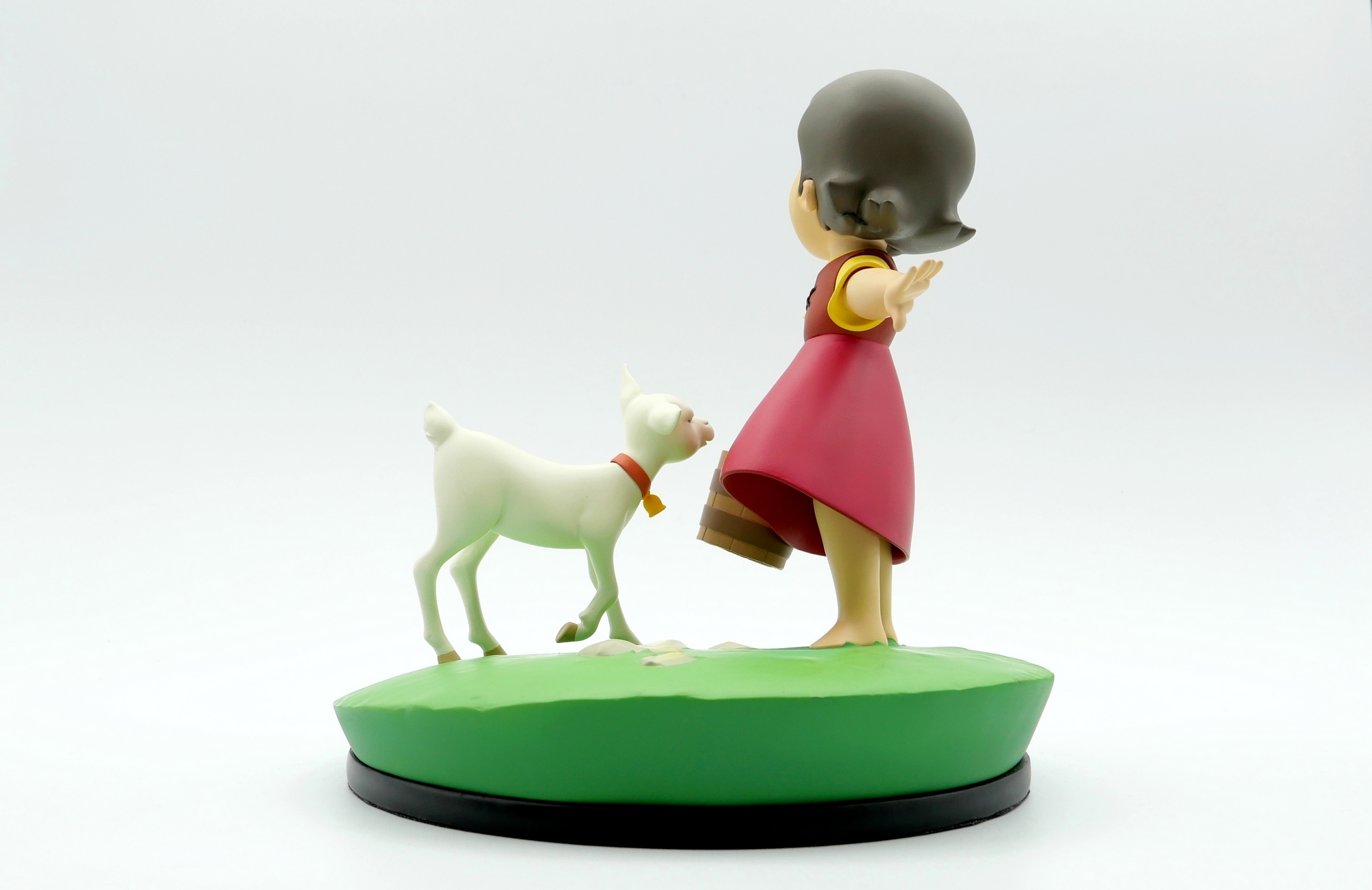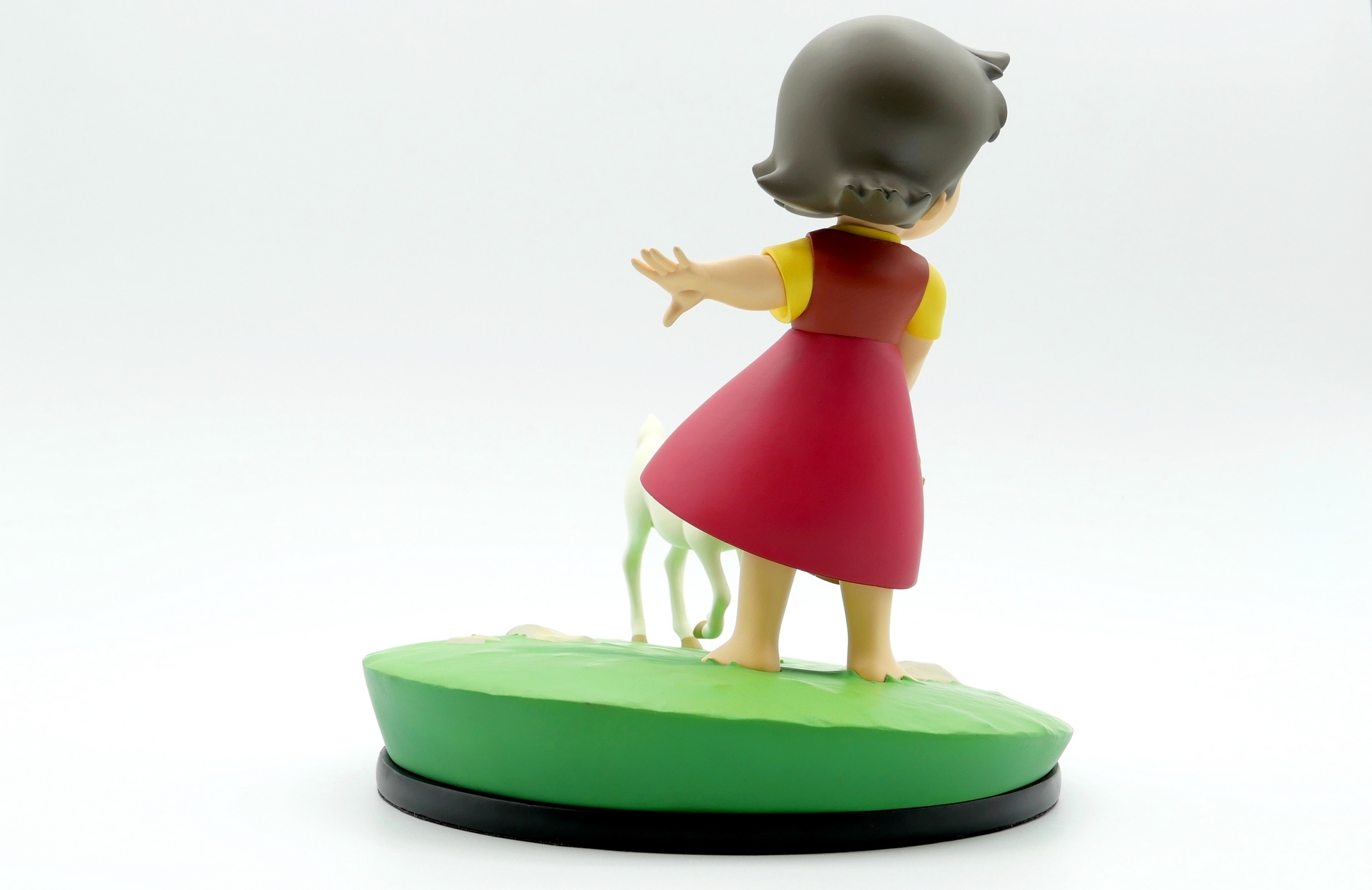 Switzerland, the mountains, Alm-Onji’s chalet, Peter and his goats, … When we think of Heidi, we immediately think of these images. The reverse is also valid; observe a lost chalet in the Swiss mountains and you might see Heidi running in the grass, barefoot of course! With this first statuette from the universe of Heidi, we wanted to feel the atmosphere of the very first episodes of the series. Those in which Heidi discovers life in the mountains alongside Alm-Onji. The making of a stool or cheese will be experienced by little Heidi as magical moments. It is in the first episode “The Mountain” that Heidi meets Snowflake. The sculpture of this statuette is freely inspired by the cover of the Japanese vinyl LP from the original soundtrack of the series.