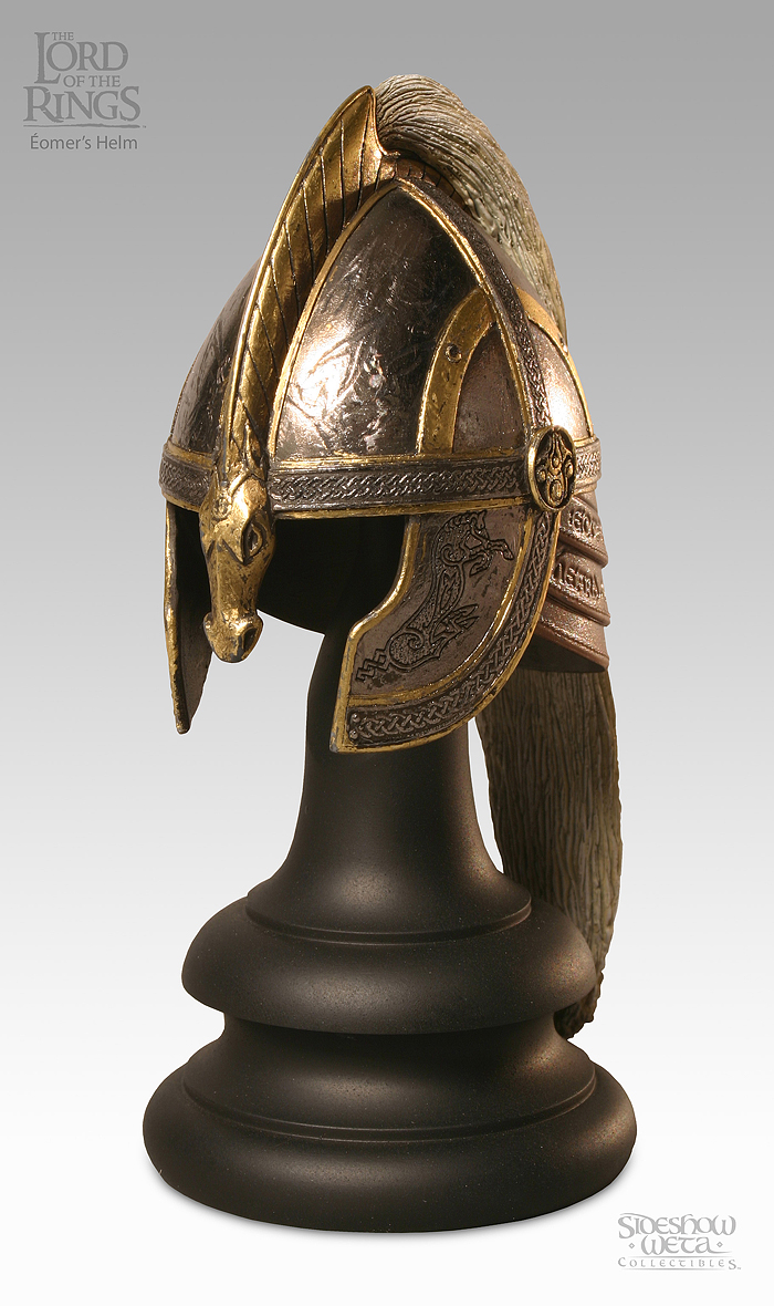 Eomer’s helm has been expertly crafted in 1:4 scale by Neil Schrader of WETA fame, a perfect copy of the helmet worn by Karl Urban in the films ‘The Two Towers’ and ‘Return of the King.’ This miniature helmet replica is made of real metal, and includes a hand-numbered display base. (from Sideshow Collectibles)