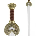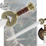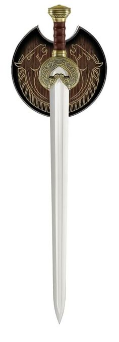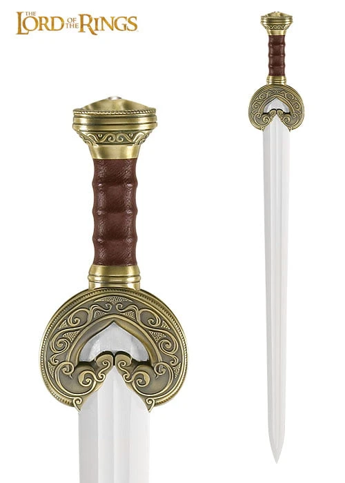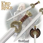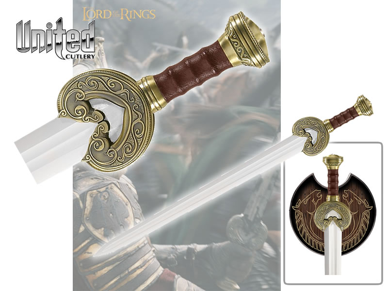 This is Herugrim, the sword of King Theoden of Rohan. This high quality item is an officially licensed reproduction from the The Lord of the Rings trilogy. This attractive battle sword measures 36 1/2″ and features a 27 1/2″ heat tempered, 420 stainless steel blade with a wide fuller. The hilt features a genuine leather wrap for a superb grip. The solid metal guard and pommel offer an antique brass plated finish, and the guard is uniquely crafted with opposing horse heads design. This item includes a certificate of authenticity and a wood display plaque with silkscreen design.