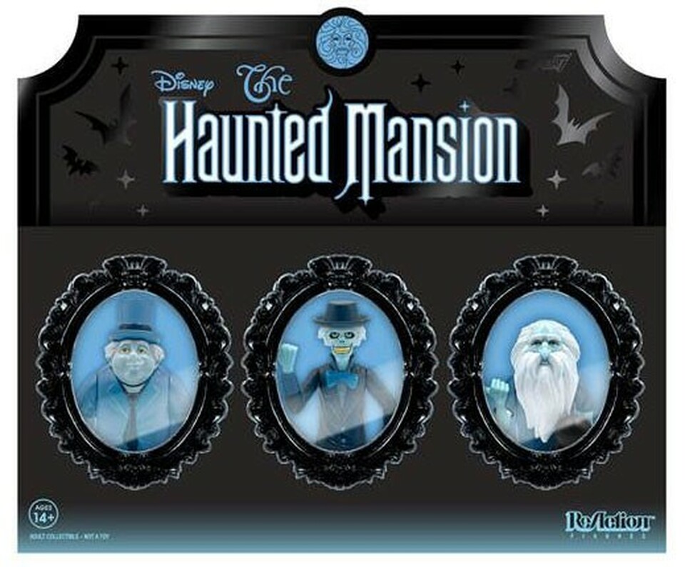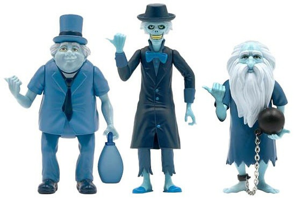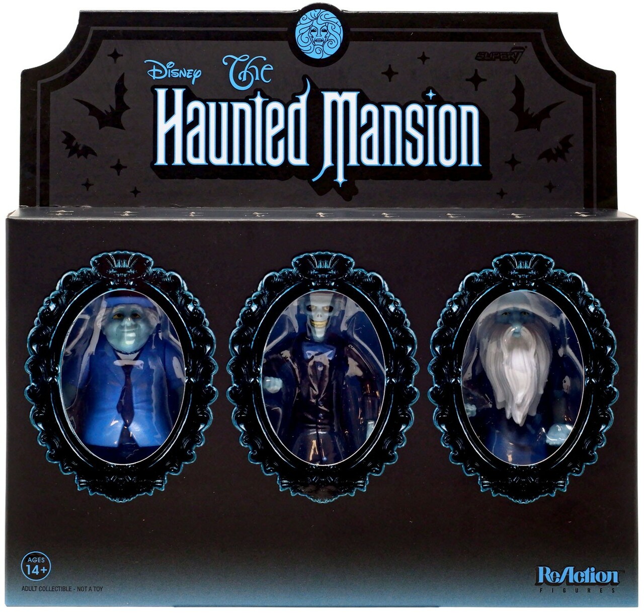Cant go to Disneyland? Never fear, were bringing Disneyland to you! This ReAction 3-pack of the Haunted Mansion rides notorious hitchhiking ghosts features chilling blue tones. Packaged in an extremely special Victorian framed display box that would look right at home on the walls of The Haunted Mansion itself; this set is sure to inspire fright and delight!