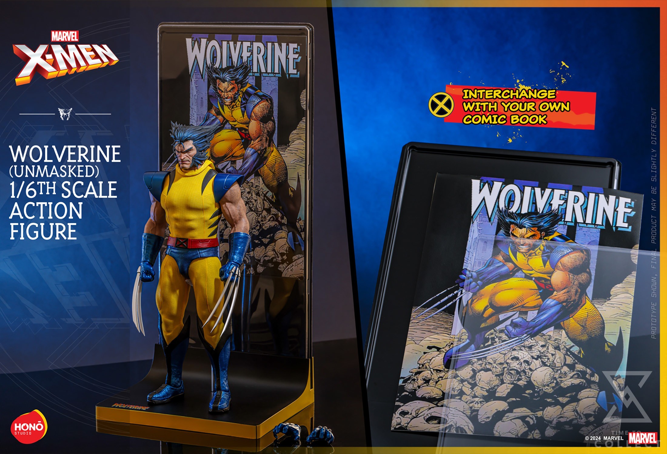 One of the most legendary comic classics, X-Men, transformed into action figures by HONŌ Studio This unmasked version of the Wolverine action figure features a detailed head sculpt that brings Logan’s rugged appearance and determined expression to life. Crafted in a vibrant yellow and metallic blue costume with animalistic stripes and a Wolverine mask in its mask-off state, this figure replicates the look of the character when he unveils his mask. This sixth-scale figure boasts multiple points of articulation and seamless silicone arms, flawlessly capturing Wolverine’s muscular build. The action figure comes with a comic cover-style backdrop and includes interchangeable hands and claws, enabling a variety of dynamic poses. It perfectly captures the essence of this iconic comic character and is a must-have for any Marvel comic fans.