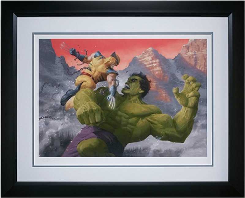 Inspired by Wolverine’s initial debut on the cover of Marvel Comics’ Incredible Hulk issue #181, this fantastic limited edition variant captures the same clash of titans with Wolverine in his original costume, in a flurry of exploding chains and razor sharp claws against a dramatic red sky.