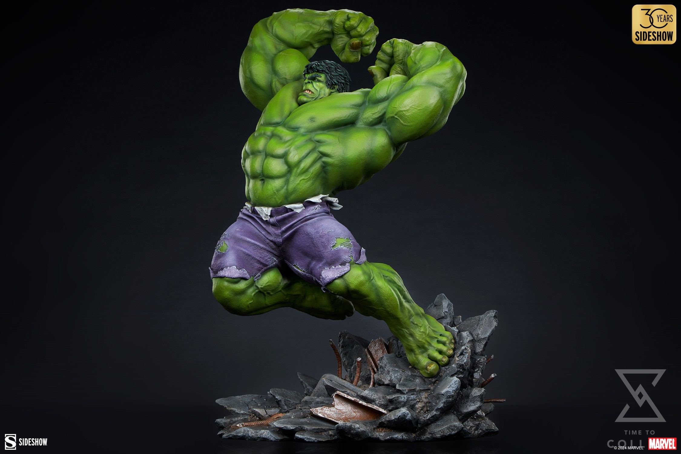 HULK SMASH! Measuring 29” tall, 15” wide, and 18” deep, the Hulk: Classic Premium Format Figure surges off a base of rubble and rebar. The Jade Giant’s sheer size and heft break the very pavement beneath his bare feet as he leaps into action. With a scowl and his big fists raised high in the air, he prepares to pummel anything in his path. Better get out of the way!