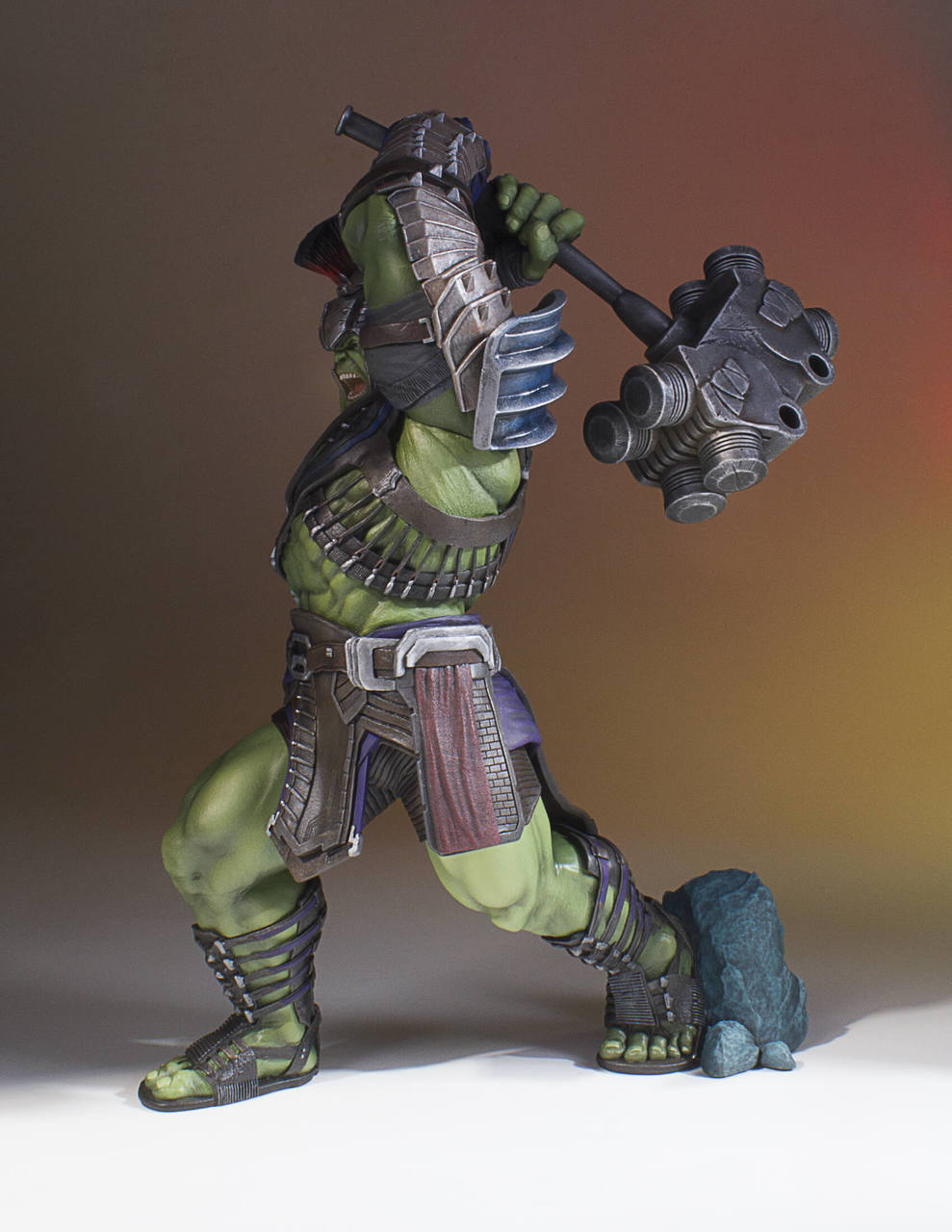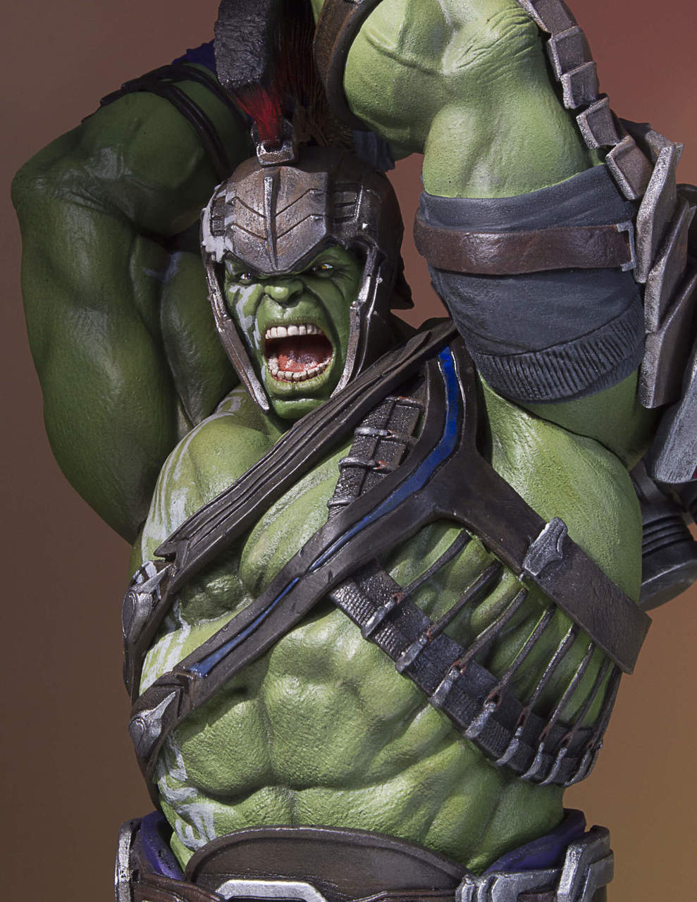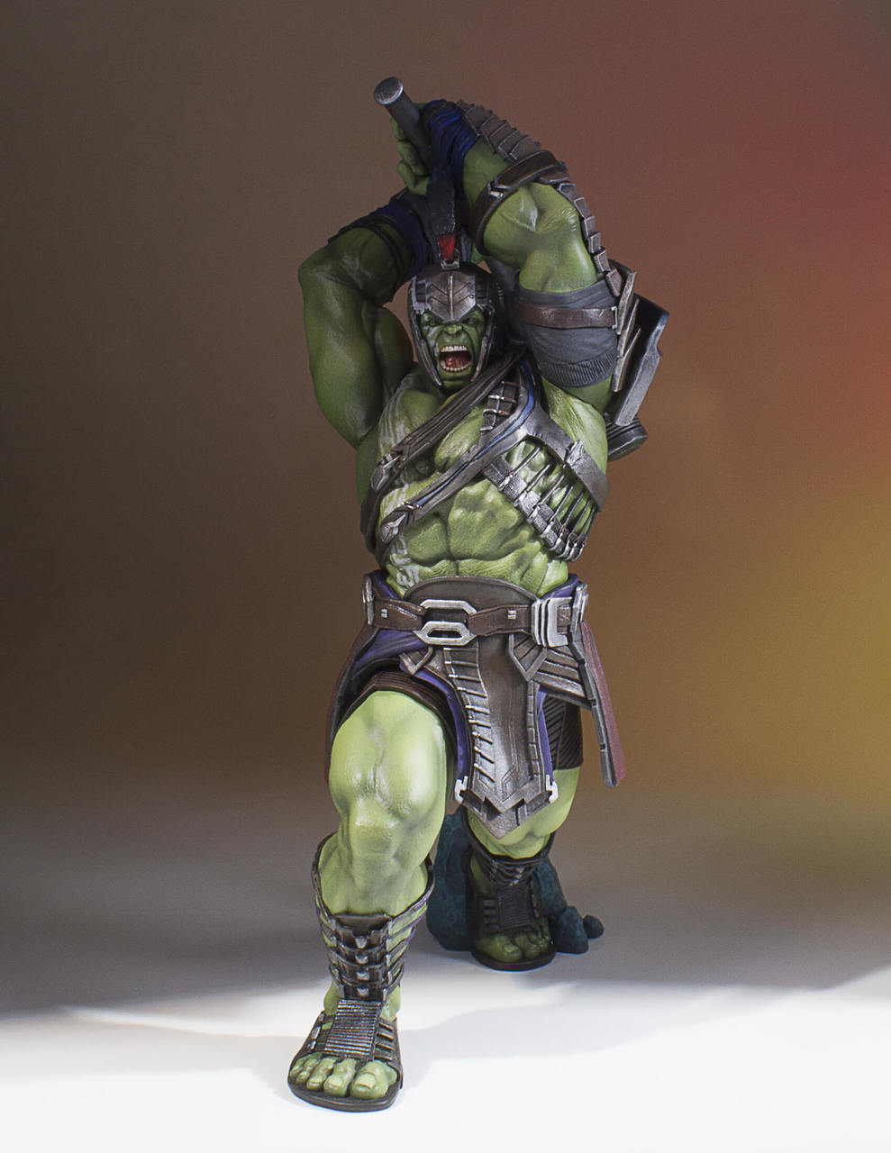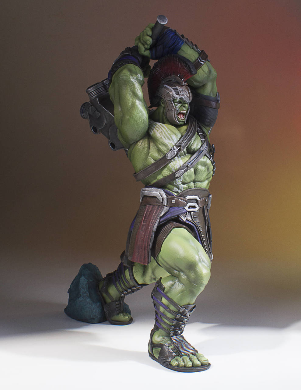 Like a raging fire, straight from his silver-screen appearance in the upcoming Thor: Ragnarok feature film, the Hulk Collector’s Gallery Statue has been digitally sculpted down the minutest detail, and hand-painted by the amazing artisans of Gentle Giant Studios. Hulk is decked out in his gladiator arena armor from the top his helmet, down to his size 32 sandals! Hulk is depicted wielding one of the biggest war-hammers you have ever seen; and you do NOT want to be on the “Hulk Smash” end of THAT!