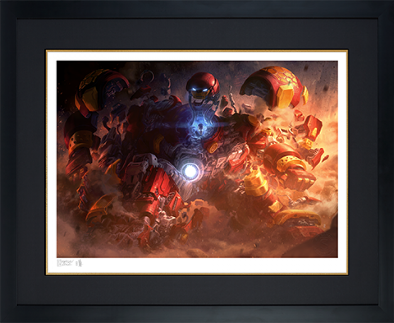 Suit up with Iron Man in this detailed original illustration of Tony Stark’s highly intuitive Hulkbuster armor assembling around him. Uniquely designed to combat the green gamma power of the Hulk himself, this gargantuan Iron Man suit is a technical marvel, consisting of hundreds of mechanical pieces interlocking around the golden Avenger in preparation for an epic battle. As clouds of exhaust and dust kick up around the Hulkbuster, the glow of Tony Stark’s arc reactor activates the armor and brings this intricate composition to life.
