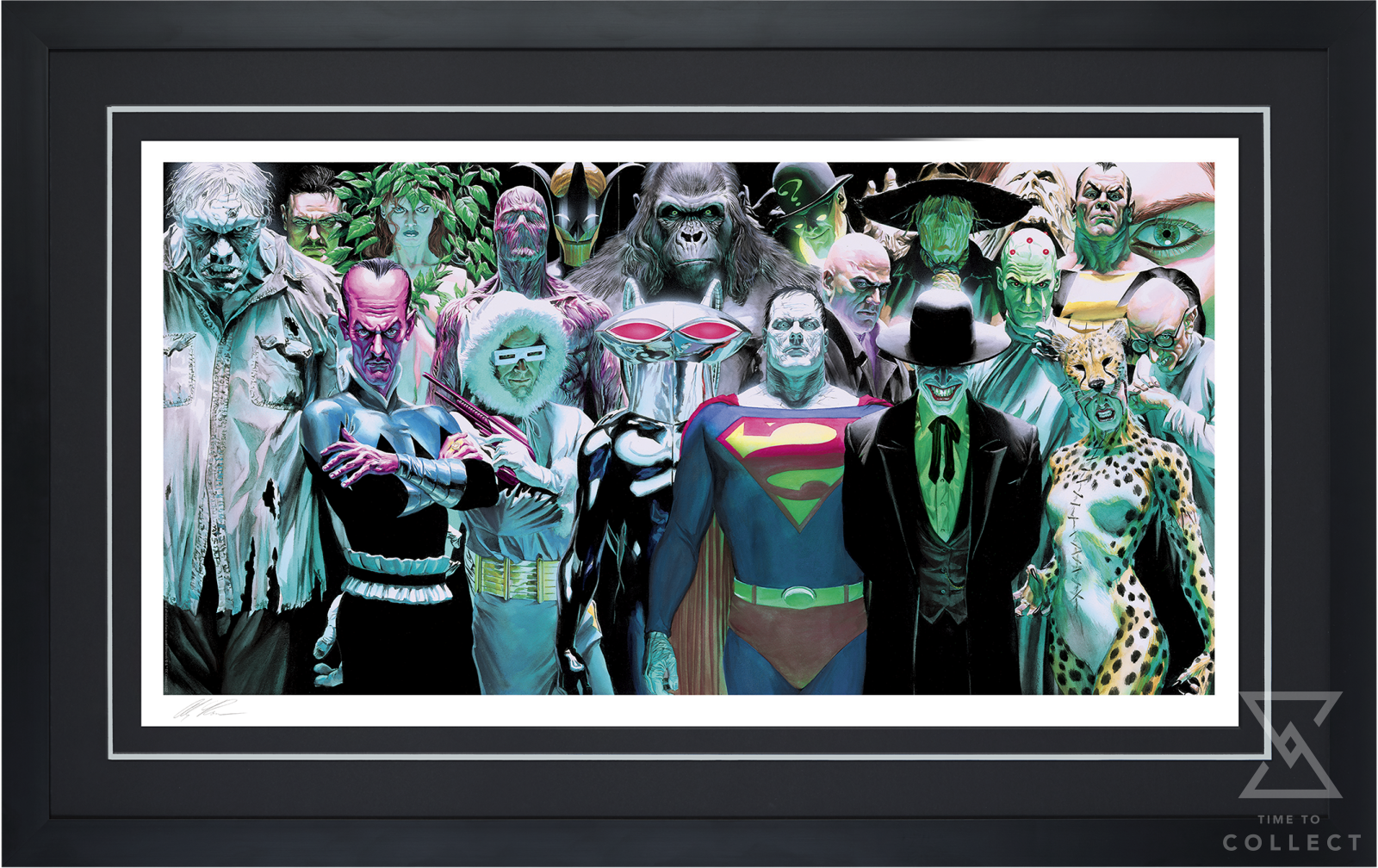 Originally designed as a variant cover for Justice #2 (2005), written by Alex Ross and Jim Krueger, this collectible comic book art is now available to fans in a fine art lithograph format. The oversized illustration features 20 of the Justice League’s infamous foes, including The Joker, Black Adam, Cheetah, Poison Ivy, and many more. Rendered in Alex Ross’ signature photorealistic style, these villains serve as a companion piece to the Infinitely Heroic Fine Art Lithograph — sold separately.