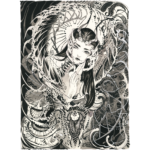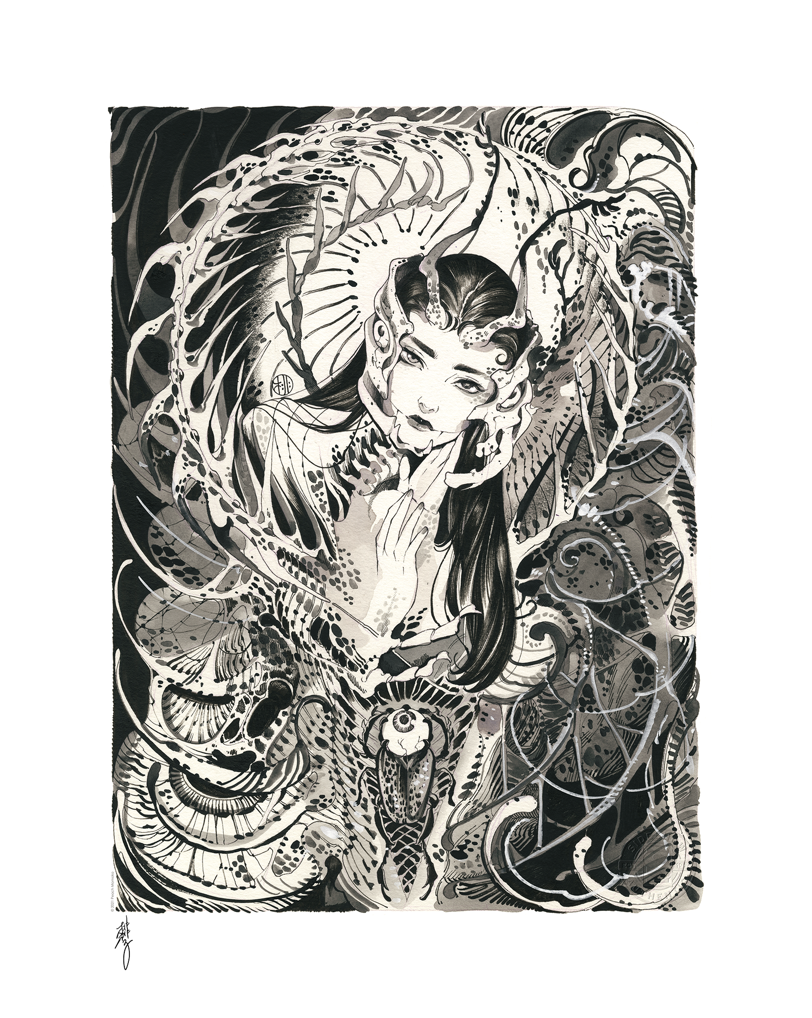 An enthralling young woman sheds her protective shell to reveal the depths of her beauty in this striking illustration by Peach Momoko. Blending human qualities with insectoid imagery, the artist creates a mesmerizing piece rife with swirling spines, strange antennae, and the woman’s soft and dreamy features drawing your gaze in to witness the metamorphosis in action. Momoko’s vision of the idealized self shines through in this moody, compelling composition in greyscale tones, exemplifying her masterful art style beloved by aficionados around the world.
