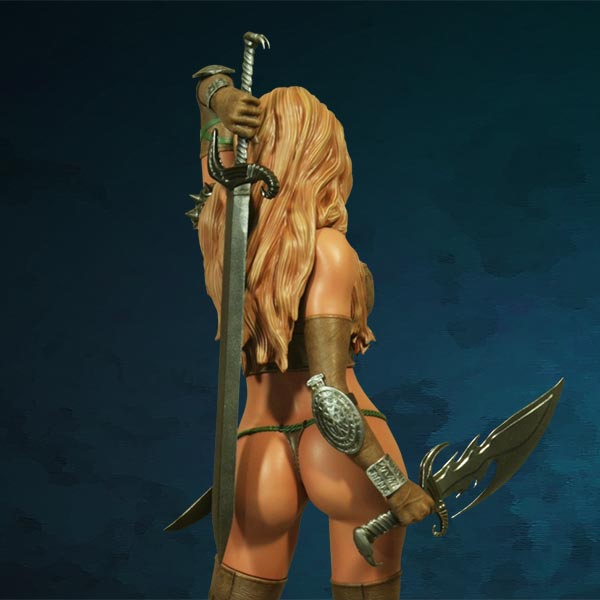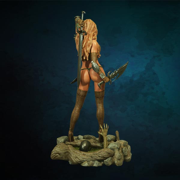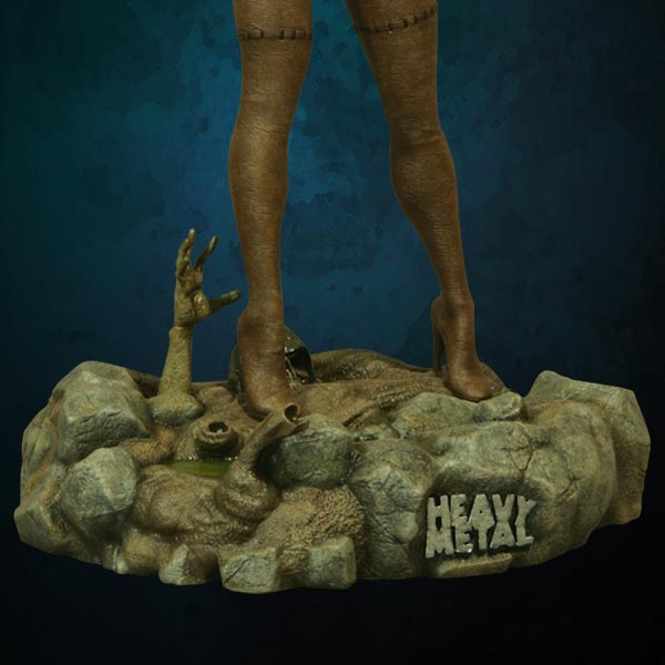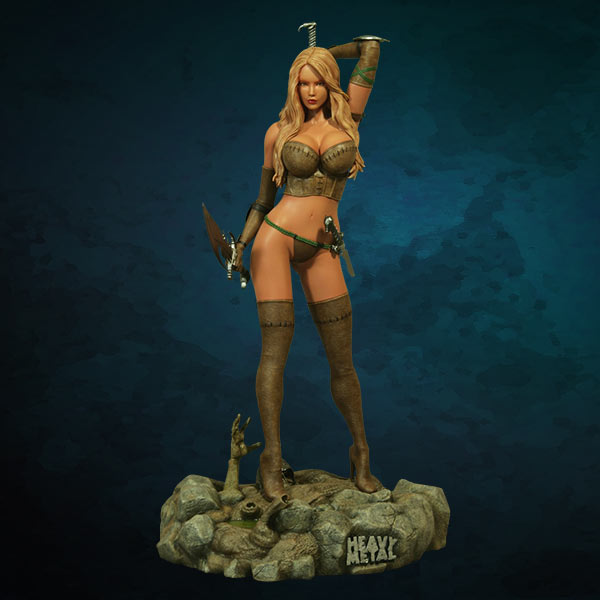 Inspired by the cover artwork from the Summer 2004 edition of Heavy Metal Magazine by James Ryman, this sexy mercenary is depicted gun in hand, standing over the Alien Creature she has just Exterminated with her sword. The highly detailed base features the slain Alien oozing green blood & is littered with the skulls of some of its earlier victims.