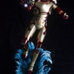 After surviving imprisonment by terrorists, billionaire industrialist Tony Stark created the Mark II armor suit. This was followed up soon after by the iconic Mark III suit used to battle Stane and his Iron Monger suit at the culmination of the first film, and the upgraded Marks IV, V, and VI armor in the sequel. He went even further with the Mark VII in Avengers, using the high-tech armor to take on the army of the Chitauri. Now we get a sneak peek at the ultimate powered armor in Stark’s Iron Man 3 Mark 42. Similar to the Mark VII, the new version is a sleek machine with overlapping plates and a unique segmented look. Iron Man blasts into action, churning up water beneath him with his thrusters. The dynamic pose catches the superhero leaning back as he fires his repulsor ray from his outstretched right hand, clenching the left for a follow up attack. The Mark 42 is resplendent in metallic red and gold with a subtle new pattern unlike any of the armors before it. This version also comes equipped with an amazing LED light-up feature in his eyes and arc reactor; three settings (Off, Continuous On, and triggered by the built-in sound detector) let you choose how and when Iron Man activates for battle!