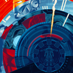 It started in a cave and changed the course of the Marvel Universe forever. Evoking both physical laboratory blueprints and virtual scientific interfaces, this colorful composition captures the evolution of Tony Stark’s iconic armor as seen in the groundbreaking film Iron Man (2008). From the clunky Mark I to the sleek Mark III, alternating blue and red rings show the layers of development and refining it took to bring this beloved hero to the skies. At the heart of it all are the arc reactor plans, proving that there’s a good man underneath all that metal.