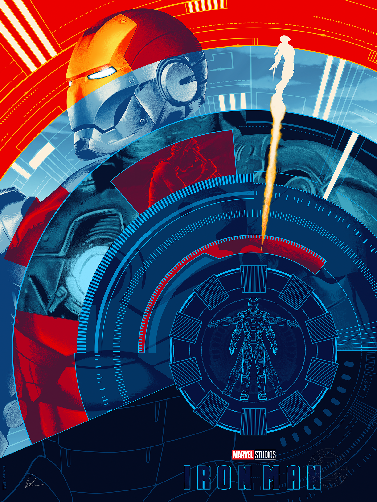 It started in a cave and changed the course of the Marvel Universe forever. Evoking both physical laboratory blueprints and virtual scientific interfaces, this colorful composition captures the evolution of Tony Stark’s iconic armor as seen in the groundbreaking film Iron Man (2008). From the clunky Mark I to the sleek Mark III, alternating blue and red rings show the layers of development and refining it took to bring this beloved hero to the skies. At the heart of it all are the arc reactor plans, proving that there’s a good man underneath all that metal.