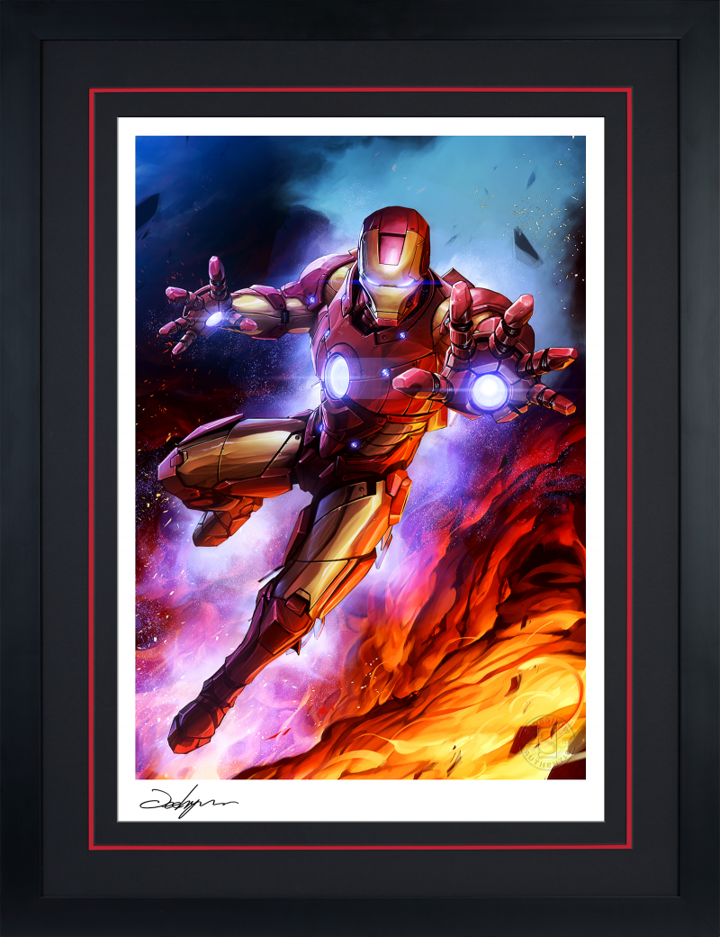 Tony Stark’s armor is overflowing with energy in the highly detailed Iron Man Fine Art Print. He rockets from the left, preparing his repulsor gauntlets, glaring out at the viewer. Despite the molten flames and impenetrable black smoke erupting in the background, Iron Man is unscathed and undeterred, ready to battle whatever comes next.