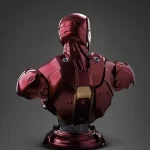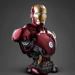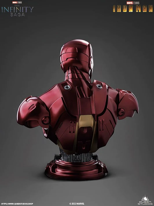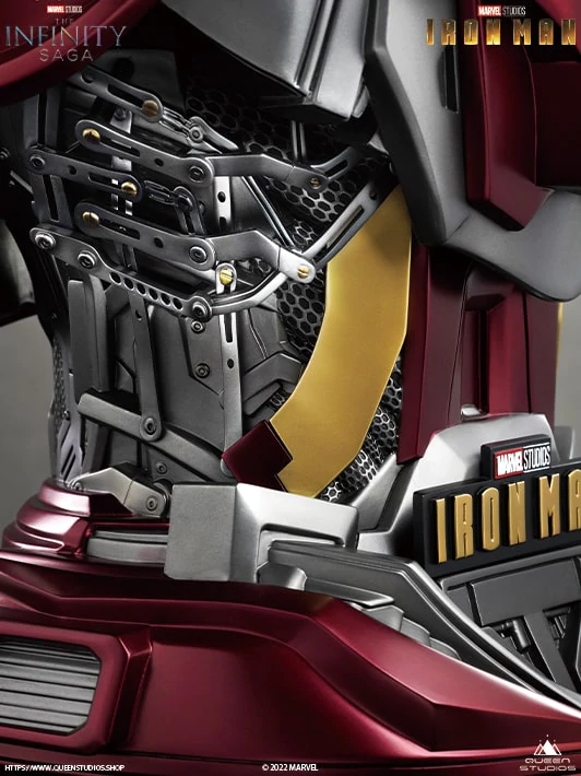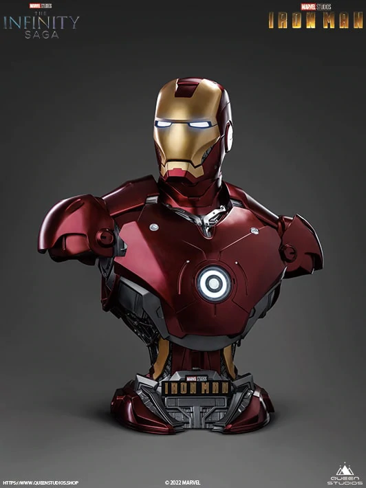 This 1/1 scale Iron Man Mark III Bust includes the full chest, back and shoulders of the Iron Man Mark III armor. From the side view of the bust, the mechanical insides of the suit are visible. Highlighting the complexity of Stark’s designs. The arc reactor is sat in the center of the chest and glows. The head is patriotically facing rightwards. Like the reactor, the eyes also glow. The base is modelled from the original MARK 3 hips and connects with the bust from the center and moves outwards to the underarms.