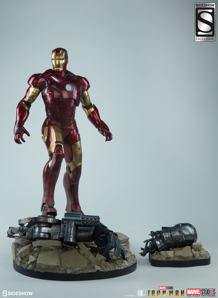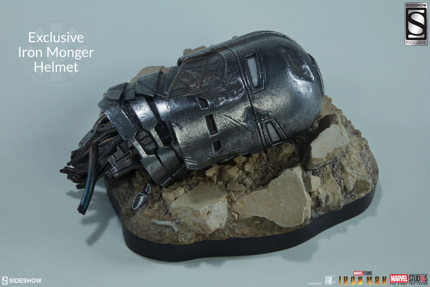 The Exclusive Edition of the Iron Man Mark III Maquette includes an Iron Monger helmet accessory on a proximity base that can be displayed alongside Iron Man or separately.