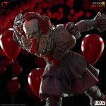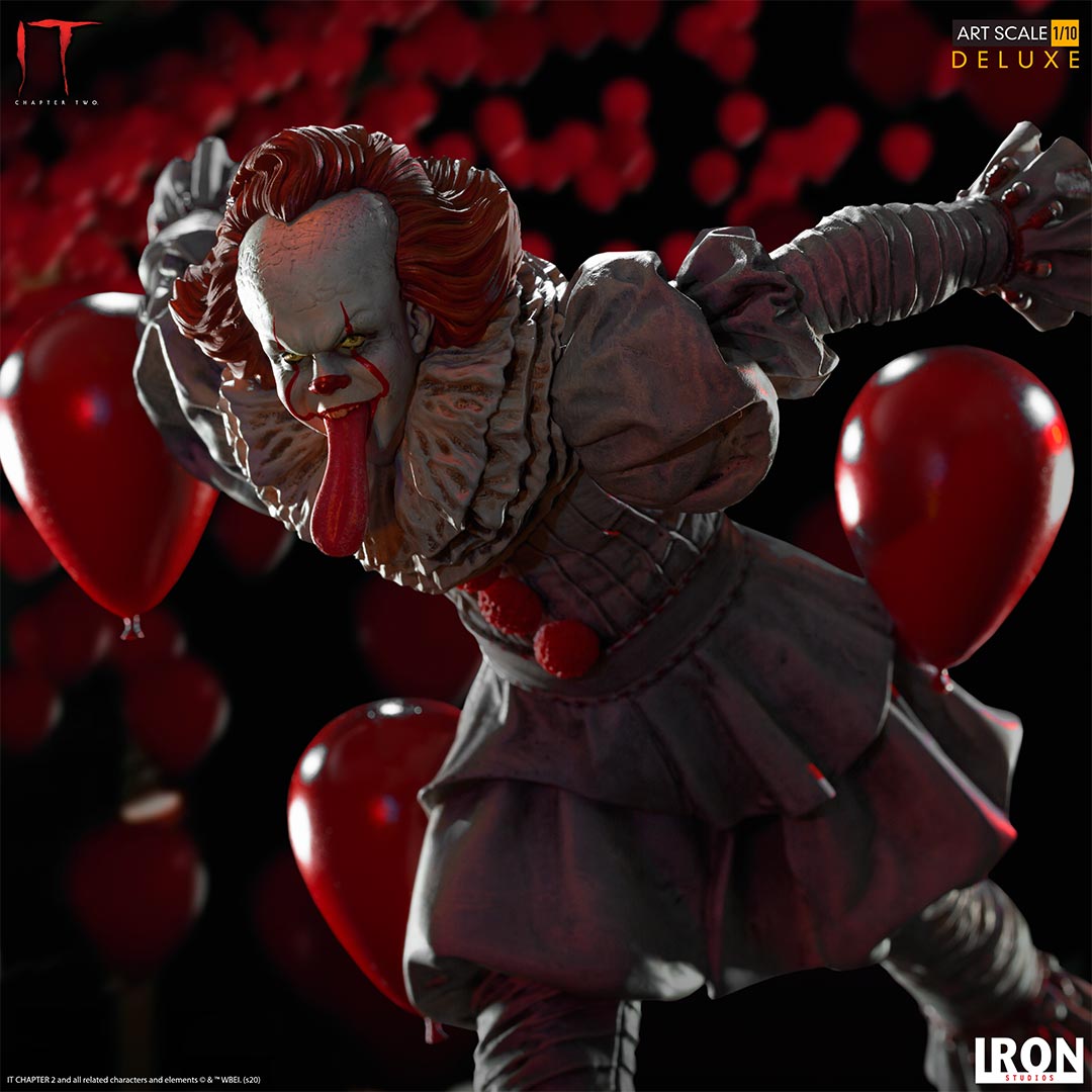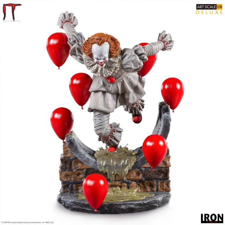 Inspired by It: Chapter Two (2019), cinematic conclusion of the adaptation of the work created by the legendary horror writer Stephen King, Iron Studios presents \”Pennywise Deluxe Art Scale 1/10 – IT Chapter Two\”, a statue that presents the antagonist of macabre tale, a shape-shifting supernatural creature that takes the form of a clown named Pennywise to attract its favorite prey, children. Iron Studios presents the sinister clown running on a base surrounded by his red balloons, as if chasing his victims through the sewer galleries of Derry, a small town, the setting of history, in Maine in the USA. The figure also features an extra interchangeable head.
