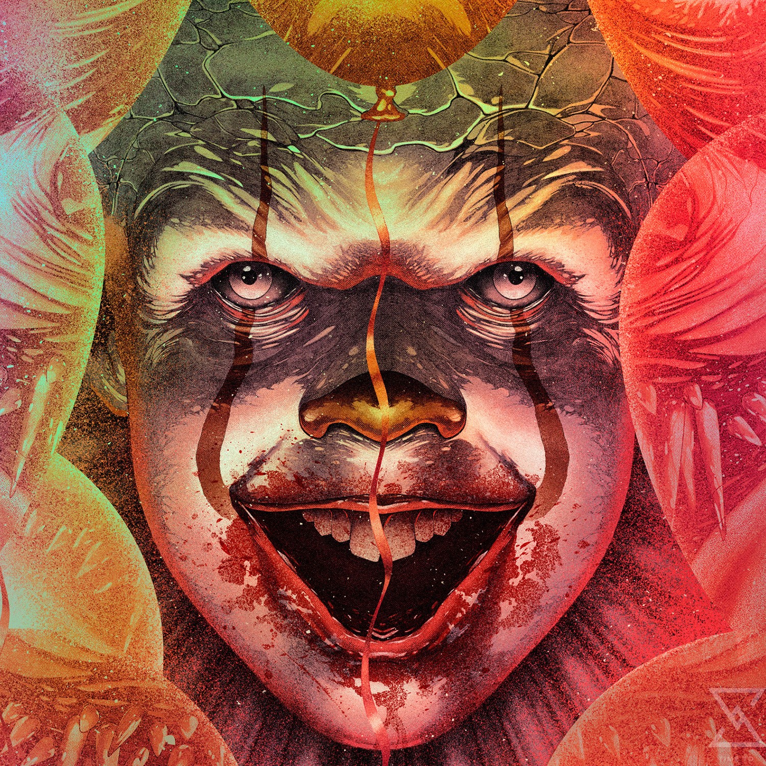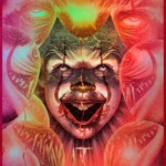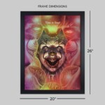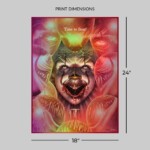 Suspend yourself in an infinite nightmare with this Pennywise portrait! The deranged dancing clown stares ahead with a smile, drawing filthy little children into his lair so that he may feast. Eater of worlds and scourge of Derry, Maine, It hides a vicious visage behind balloons and circus paint. If you can hear the music and see the Deadlights, it’s already too late…