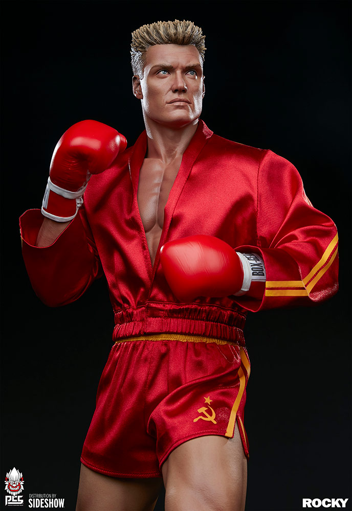 The Ivan Drago 1:3 Scale Statue features tailored red and gold fabric shorts accented with a hammer and sickle design. He also includes a matching jacket that can be displayed on the figure or nearby on the accompanying proximity stand. Finished with sculpted red and gold boots, red and white socks, and red gloves, Ivan Drago is ready for a final fight against Rocky Balboa.