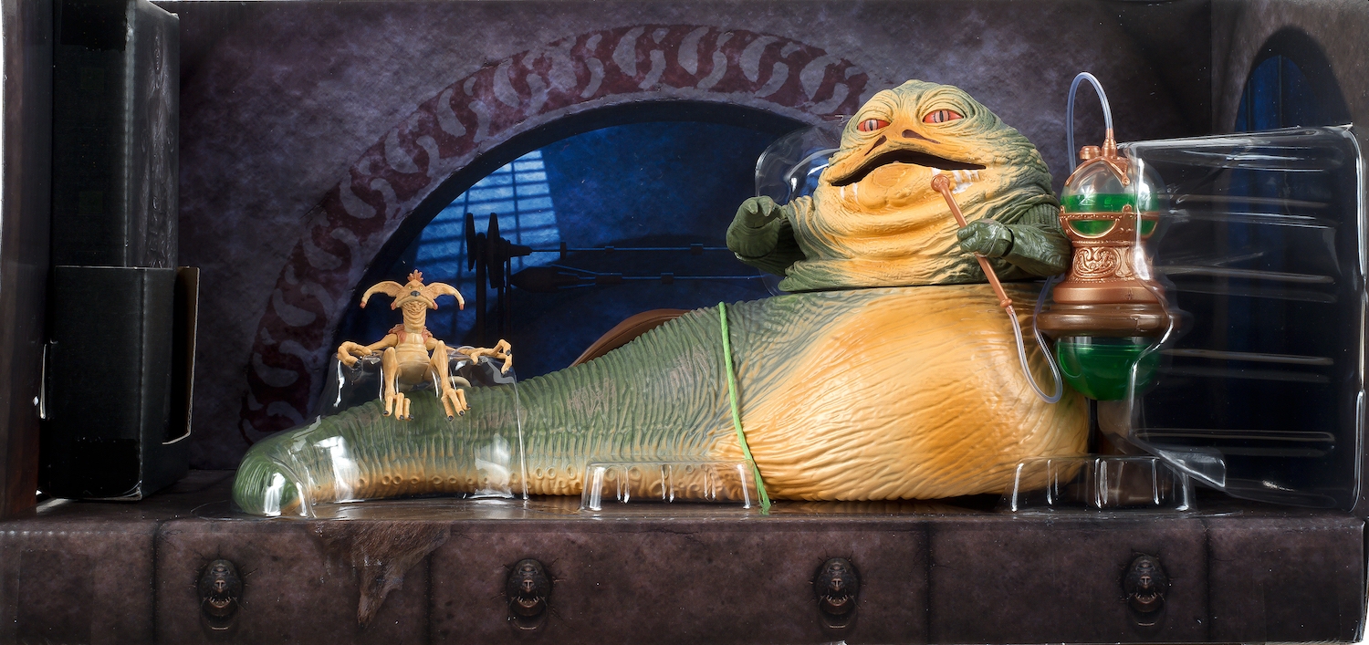 2014 SDCC Black Series Jabba the Hutt. This 6-inch figure also comes complete with a hookah and his cackling, diminutive sidekick Salacious Crumb. The box features some Huttese – and what looks like enough room to place last year’s Comic-Con exclusive Black Series Han Solo in Carbonite.