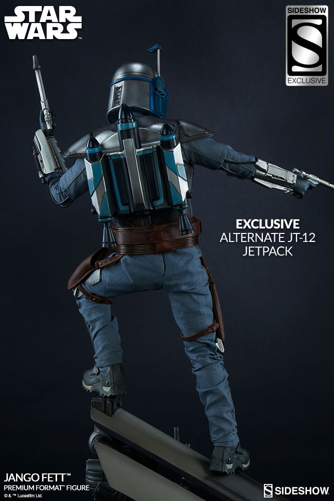 The Jango Fett Premium Format™ Figure features Mandalorian armor, the Z-6 jetpack, and he wields a pair of WESTAR-34 blasters. The Sideshow exclusive version includes a switchable JT-12 jetpack for more display options.